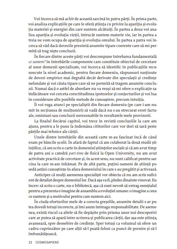 Cosmosapiens se adresează cititorilor pasionați de înțelegerea științifică a lumii și oferă cea mai cuprinzătoare analiză a ideilor științifice actuale, de la inflația cosmică, energia întunecată și formarea Pământului până la apariția vieții, dezvoltarea cooperării și manifestările conștiinței. Prin acest demers, autorul așază evoluția omului în contextul evoluției vieții și a materiei ce alcătuiește întregul univers, arătându-ne totodată cât de multe lucruri am aflat despre noi înșine și lumea în care trăim și cât de multe vom putea descoperi într-un viitor nu foarte îndepărtat.