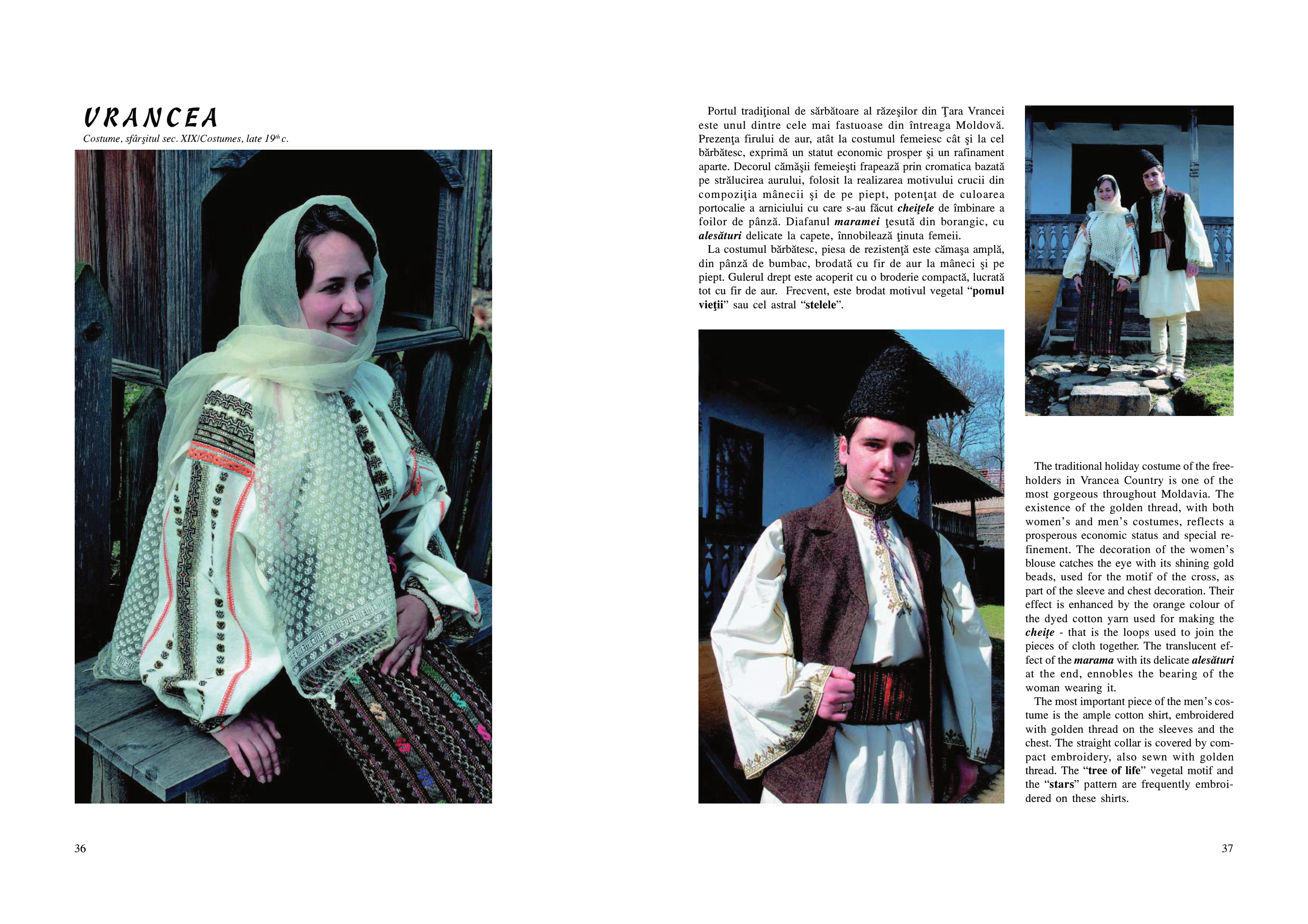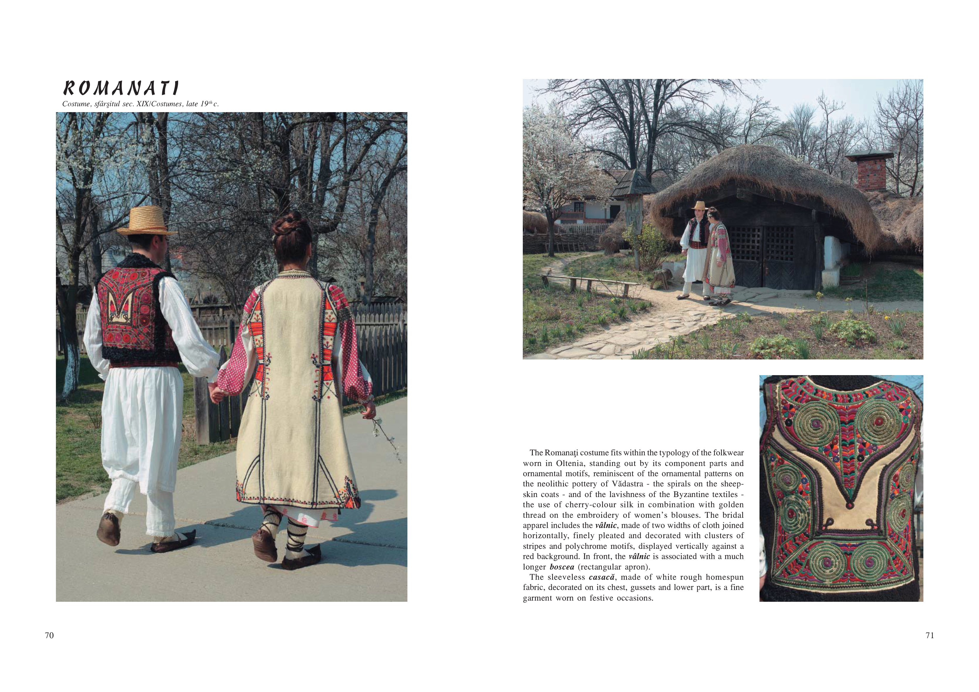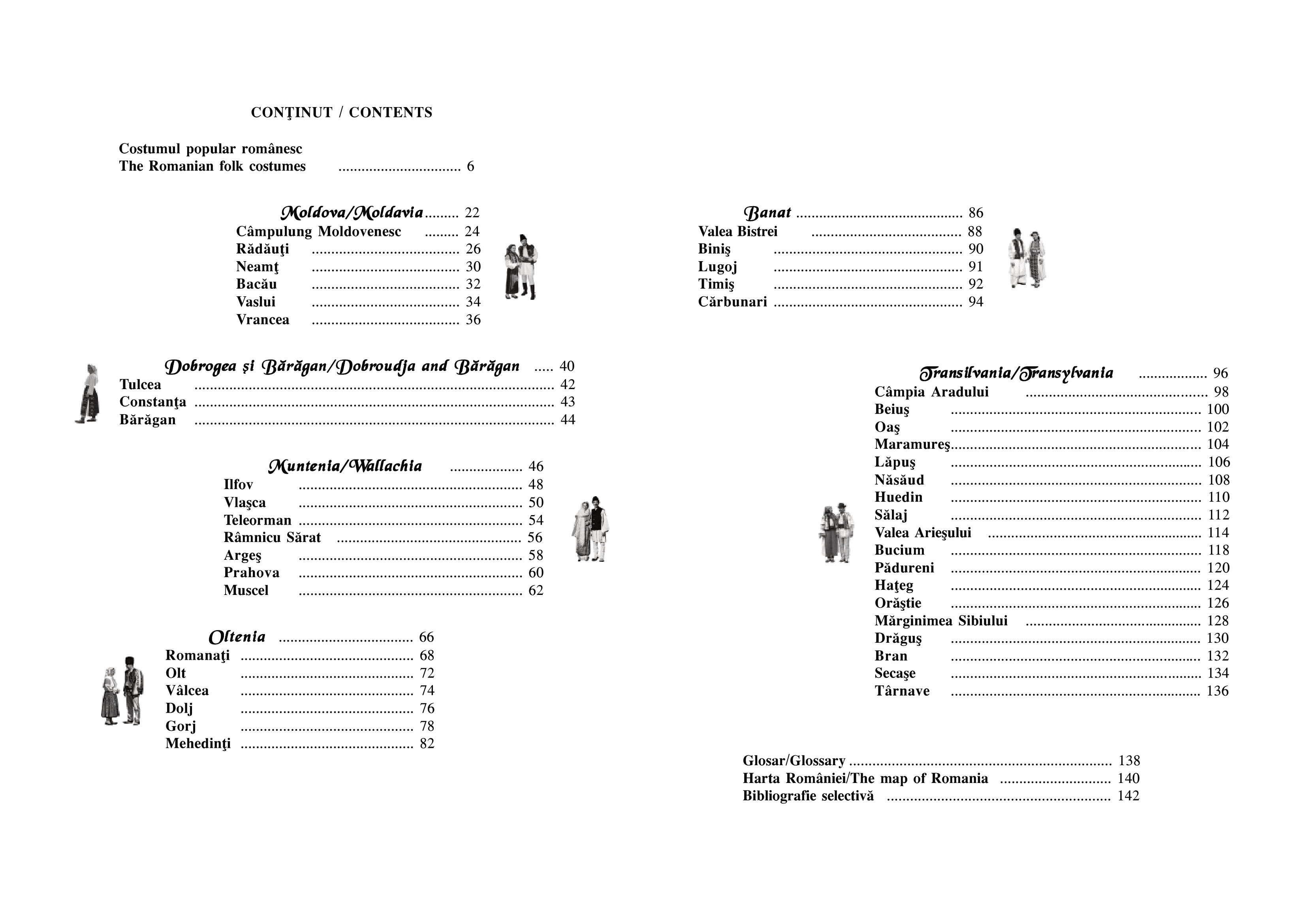 Rând pe rând, sunt înfăţişate publicului costume din aproape toate zonele enografice ale ţării, grupate pe marile regiuni: Moldova, Dobrogea şi Bărăgan, Muntenia, Oltenia, Banat, Transilvania. Pentru fiecare dintre acestea sunt analizate particularităţile, originaliatea, unicitatea şi în acelaşi timp, modul în care se încadrează în unitatea de ansamblu a costumului românesc. Obiectele de îmbrăcăminte sunt prezentate cu denumirile specific zonelor de proveniență, iar imaginile color redau armonia de culori ce îl impresionează până la admiraţie pe cititor.