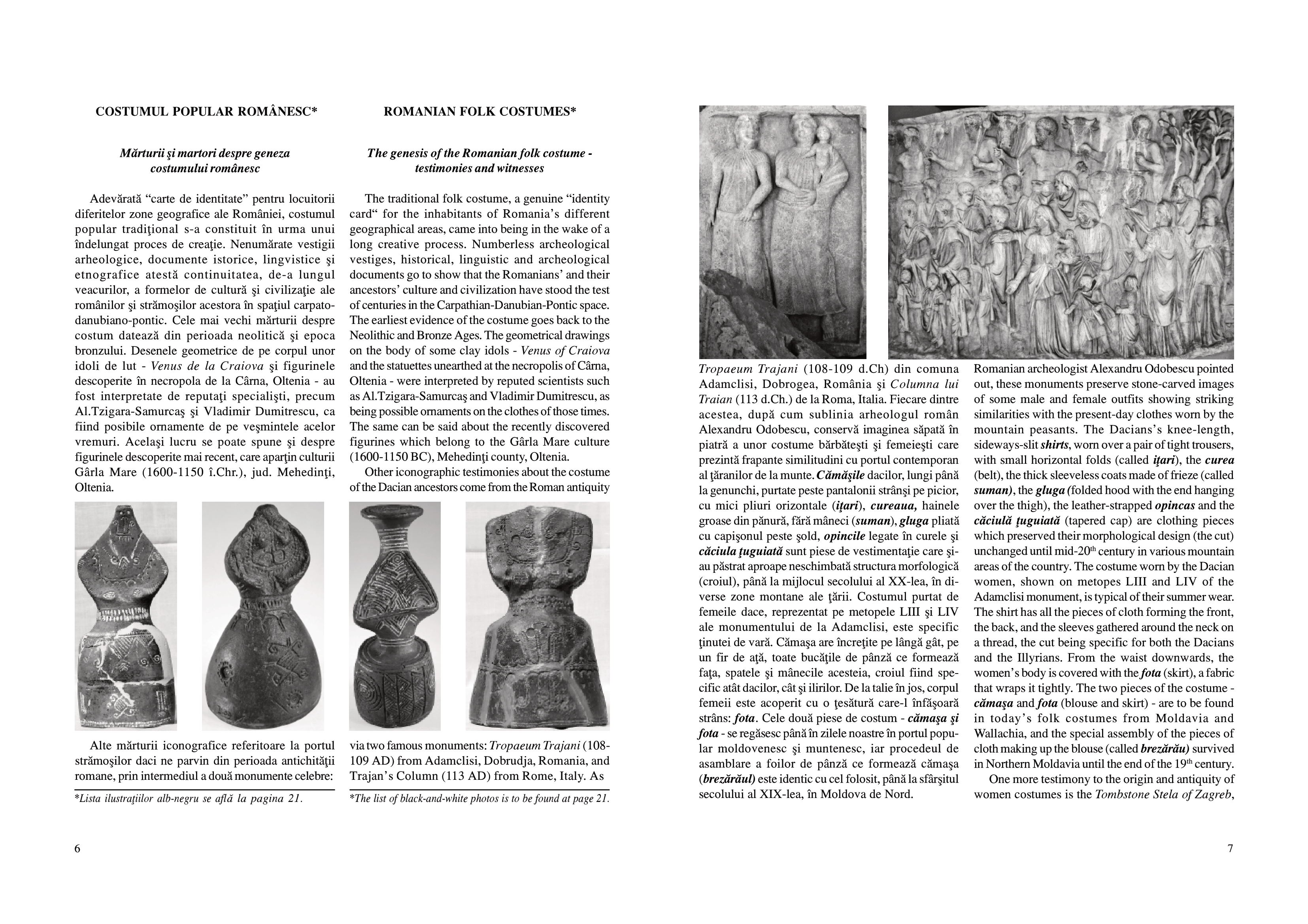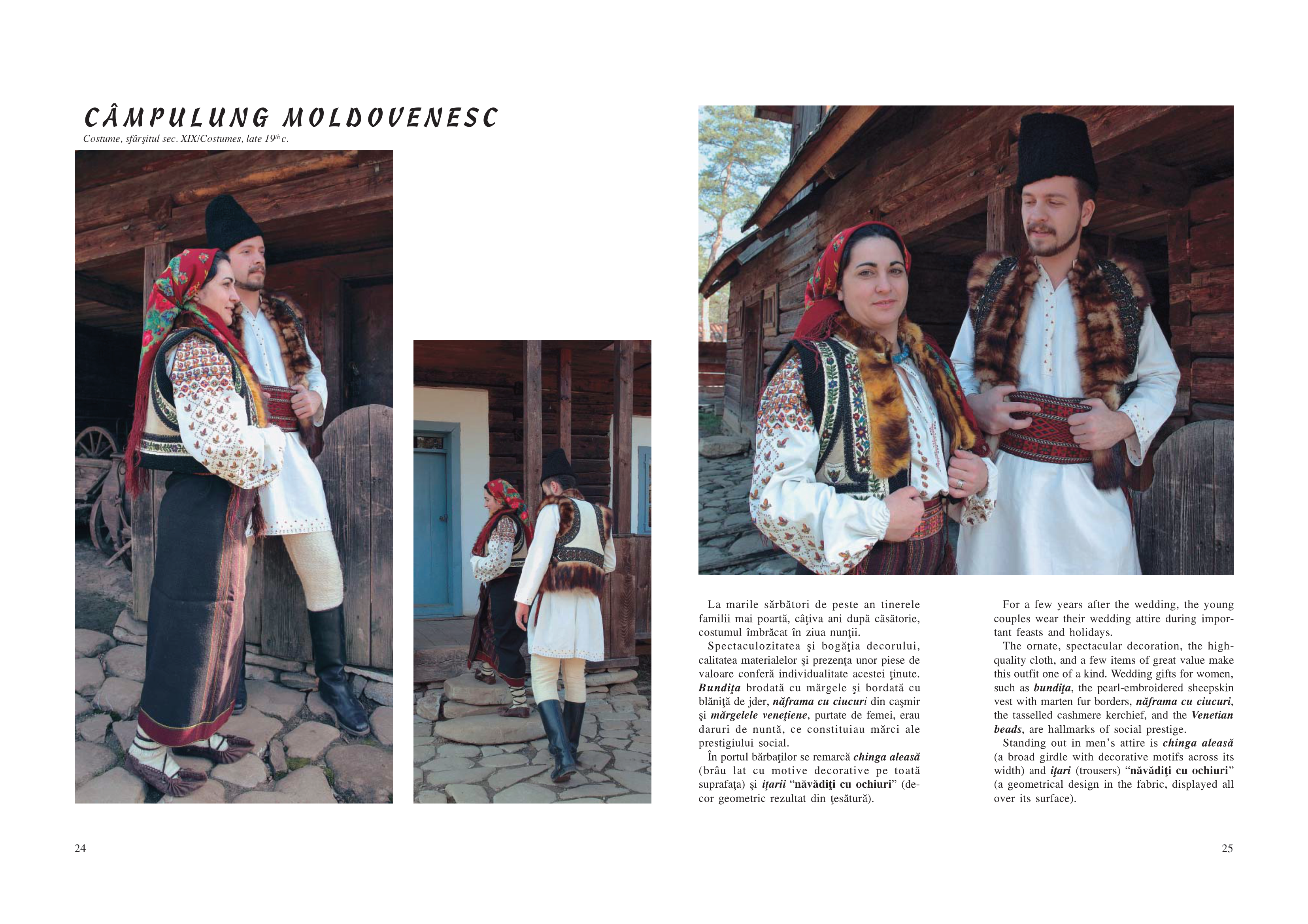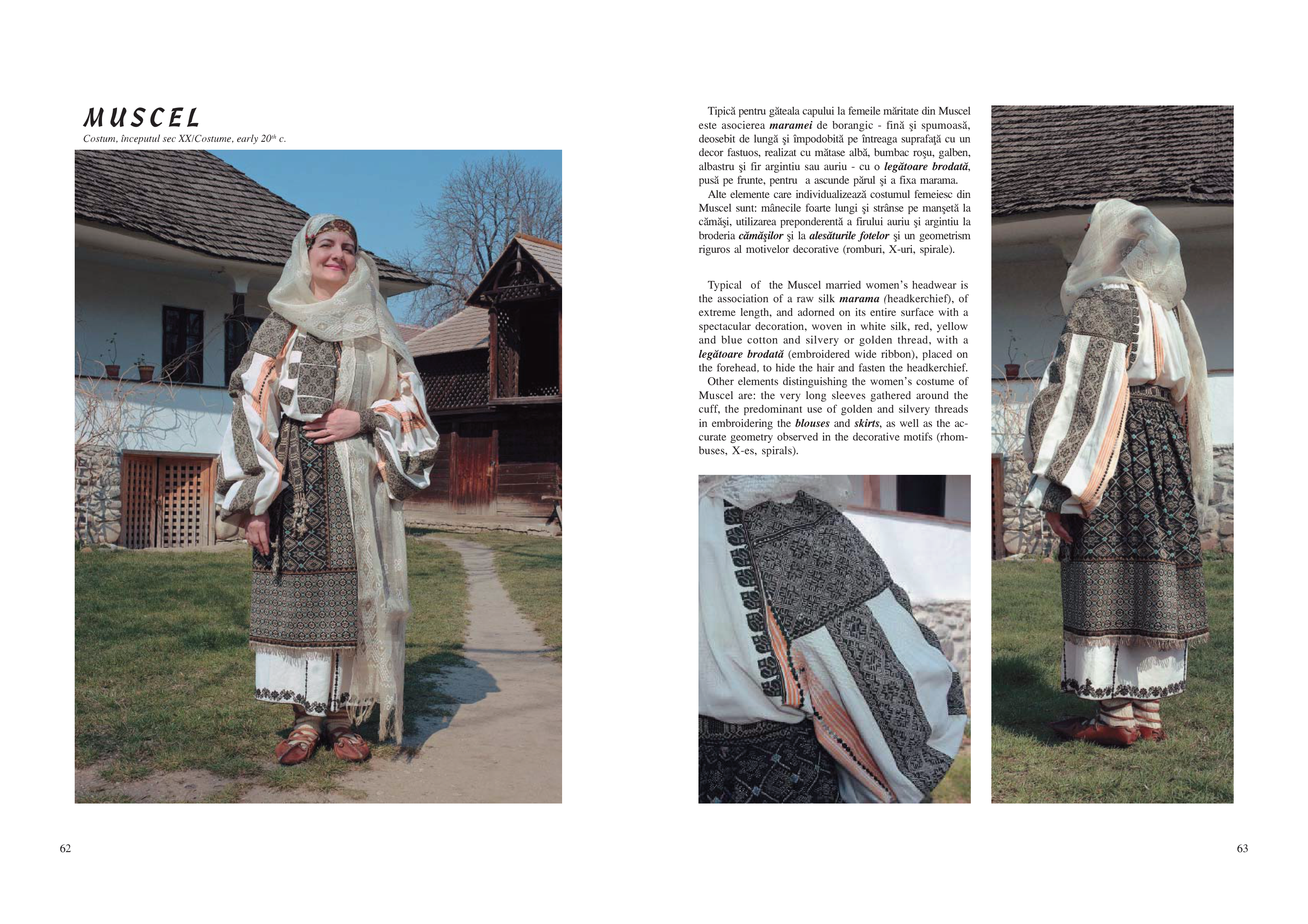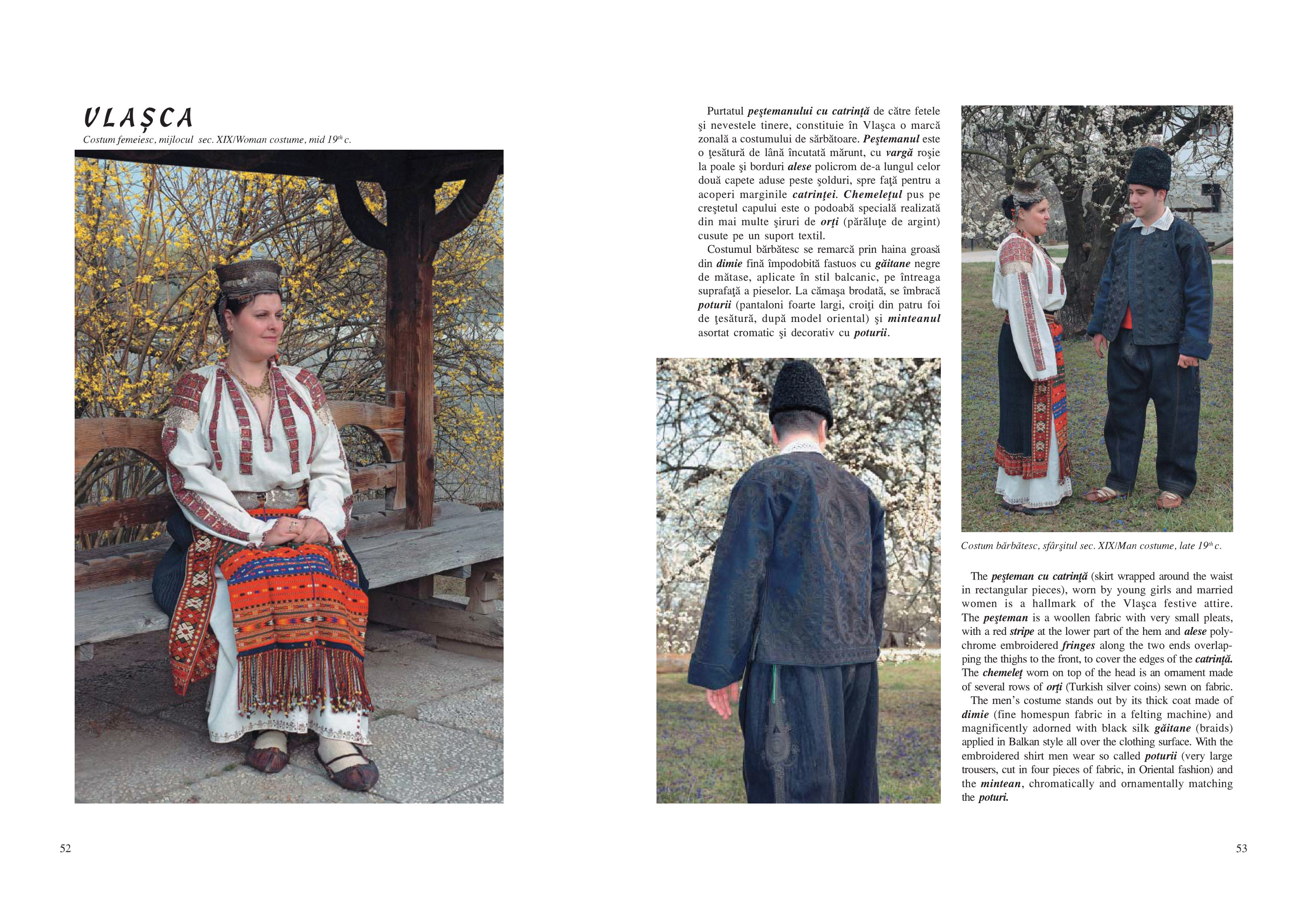 Rând pe rând, sunt înfăţişate publicului costume din aproape toate zonele enografice ale ţării, grupate pe marile regiuni: Moldova, Dobrogea şi Bărăgan, Muntenia, Oltenia, Banat, Transilvania. Pentru fiecare dintre acestea sunt analizate particularităţile, originaliatea, unicitatea şi în acelaşi timp, modul în care se încadrează în unitatea de ansamblu a costumului românesc. Obiectele de îmbrăcăminte sunt prezentate cu denumirile specific zonelor de proveniență, iar imaginile color redau armonia de culori ce îl impresionează până la admiraţie pe cititor.