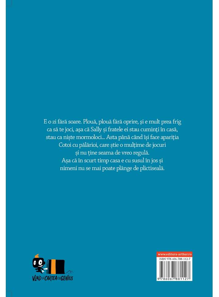 E o zi fără soare. Plouă, plouă fără oprire şi e mult prea frig ca să te joci, aşa că Sally și fratele ei stau cuminţi în casă, stau ca niște mormoloci... Asta până când își face apariţia un Cotoi cu pălărioi, care știe o mulţime de jocuri și nu ține seama de vreo regulă. Așa că în scurt timp casa e cu susul în jos și nimeni nu se mai poate plânge de plictiseală.