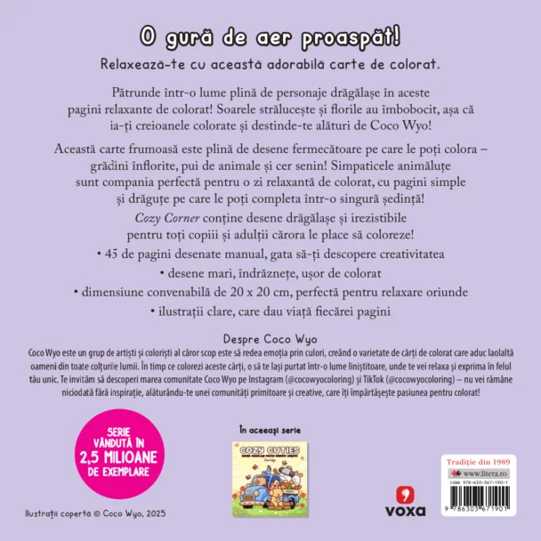 Pătrunde într-o lume plină de personaje drăgălașe în aceste pagini relaxante de colorat! Soarele strălucește și florile au îmbobocit, așa că ia-ți creioanele colorate și destinde-te alături de Coco Wyo!