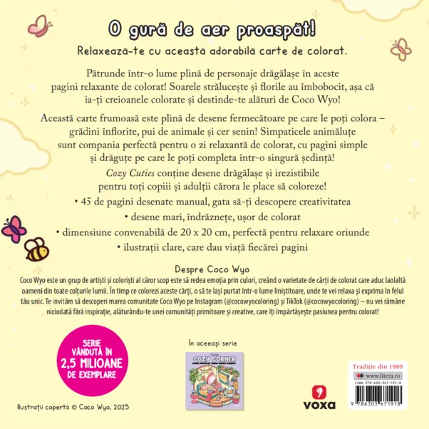 Relaxează-te cu această adorabilă carte de colorat. Pătrunde într-o lume plină de personaje drăgălașe în aceste pagini relaxante de colorat! Soarele strălucește și florile au îmbobocit, așa că ia-ți creioanele colorate și destinde-te alături de Coco Wyo!