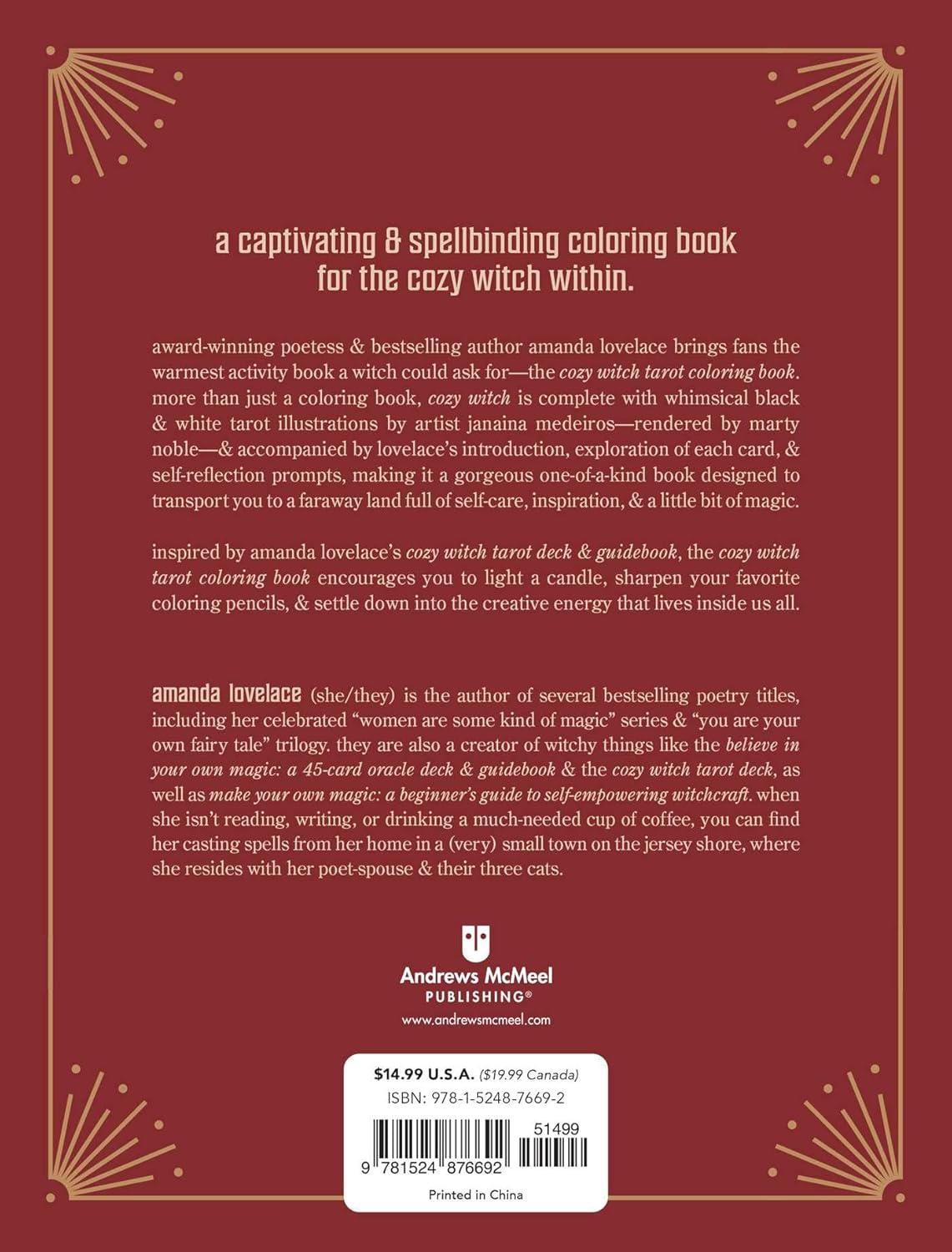 Award-winning poetess and author amanda lovelace brings fans the warmest activity book a witch could ask for––the cozy witch tarot coloring book. Whimsical black & white tarot illustrations by Janaina Medeiros—and rendered by Marty Noble—accompanied by lovelace’s introduction, exploration of each card, and self-reflection prompts, make for a gorgeous package designed to transport you to a faraway land full of self-care, inspiration, and a little bit of magic.