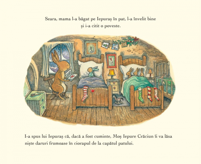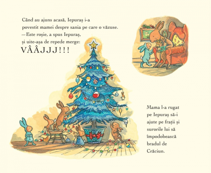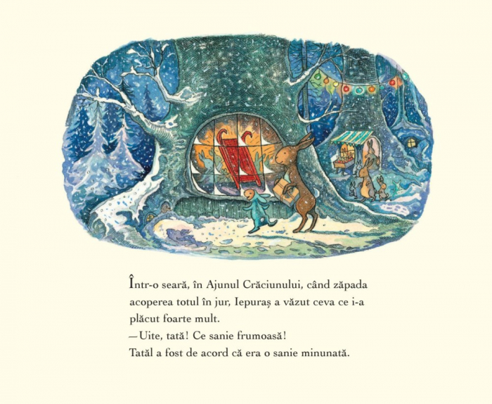 O carte incantatoare prin ilustratii si prin mesaj. O poveste de Craciun despre prietenie si solidaritate, despre spiritul Craciunului si distractia copiilor din preajma sarbatorilor. Atunci cand micul iepuras primeste o sanie cadou, nu vrea sa o imparta cu prietenii. Dar cand o rupe, acestia ii sunt alaturi si o repara impreuna. Apoi se distreaza toti, ajungand la concluzia ca cele mai frumoase sarbatori sunt cele petrecute impreuna cu prietenii ca d imparti tot ce ai mai bun si mai frumos.