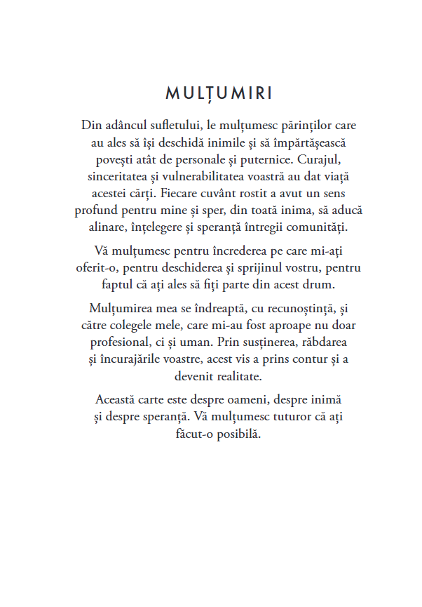 Este o carte despre fragilitate si forta, despre lacrimi si despre prima data cand un copil rosteste „mama” dupa ani de tacere. Dincolo de termeni medicali si explicatii clinice, aici gasim oameni.