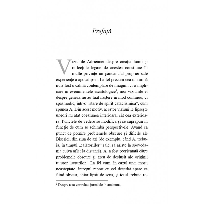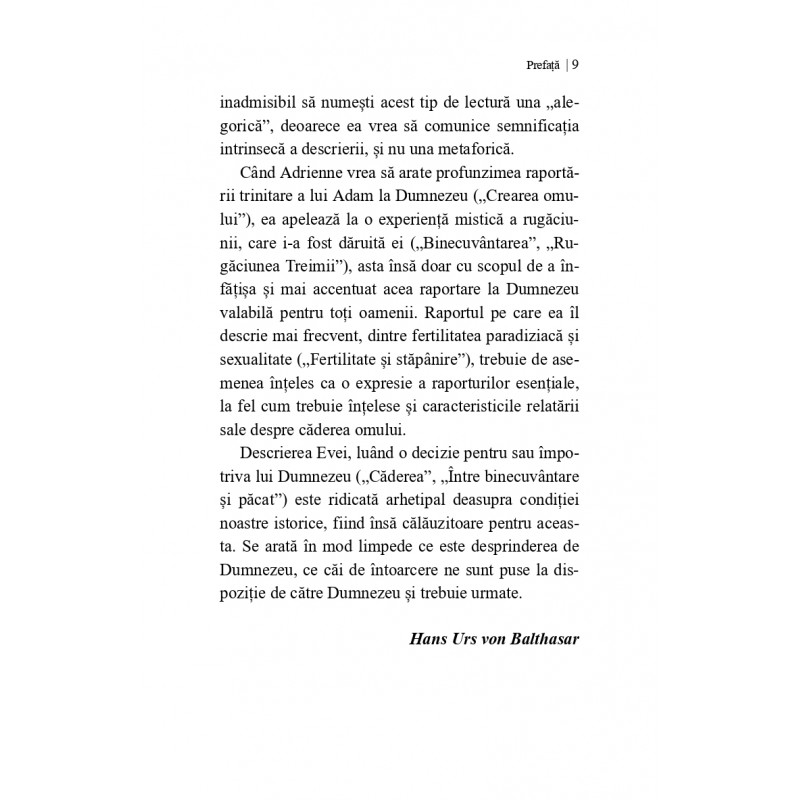 Când Adrienne vrea să arate profunzimea raportării trinitare a lui Adam la Dumnezeu („Crearea omului”), ea apelează la o experienţă mistică a rugăciunii, care i-a fost dăruită ei (,Binecuvântarea", ,,Rugăciunea Treimii"), asta însă doar cu scopul de a înfăţişa şi mai accentuat acea raportare la Dumnezeu valabilă pentru toţi oamenii. Raportul pe care ea îl descrie mai frecvent, dintre fertilitatea paradiziacă şi sexualitate („Fertilitate şi stăpânire"), trebuie de asemenea înţeles ca o expresie a raporturilor esenţiale, la fel cum trebuie înţelese şi caracteristicile relatării sale despre căderea omului.