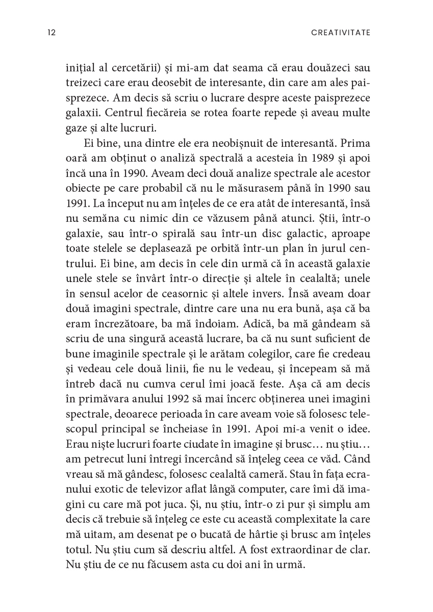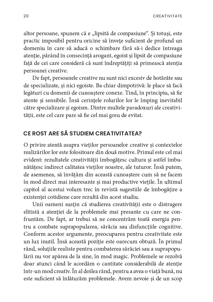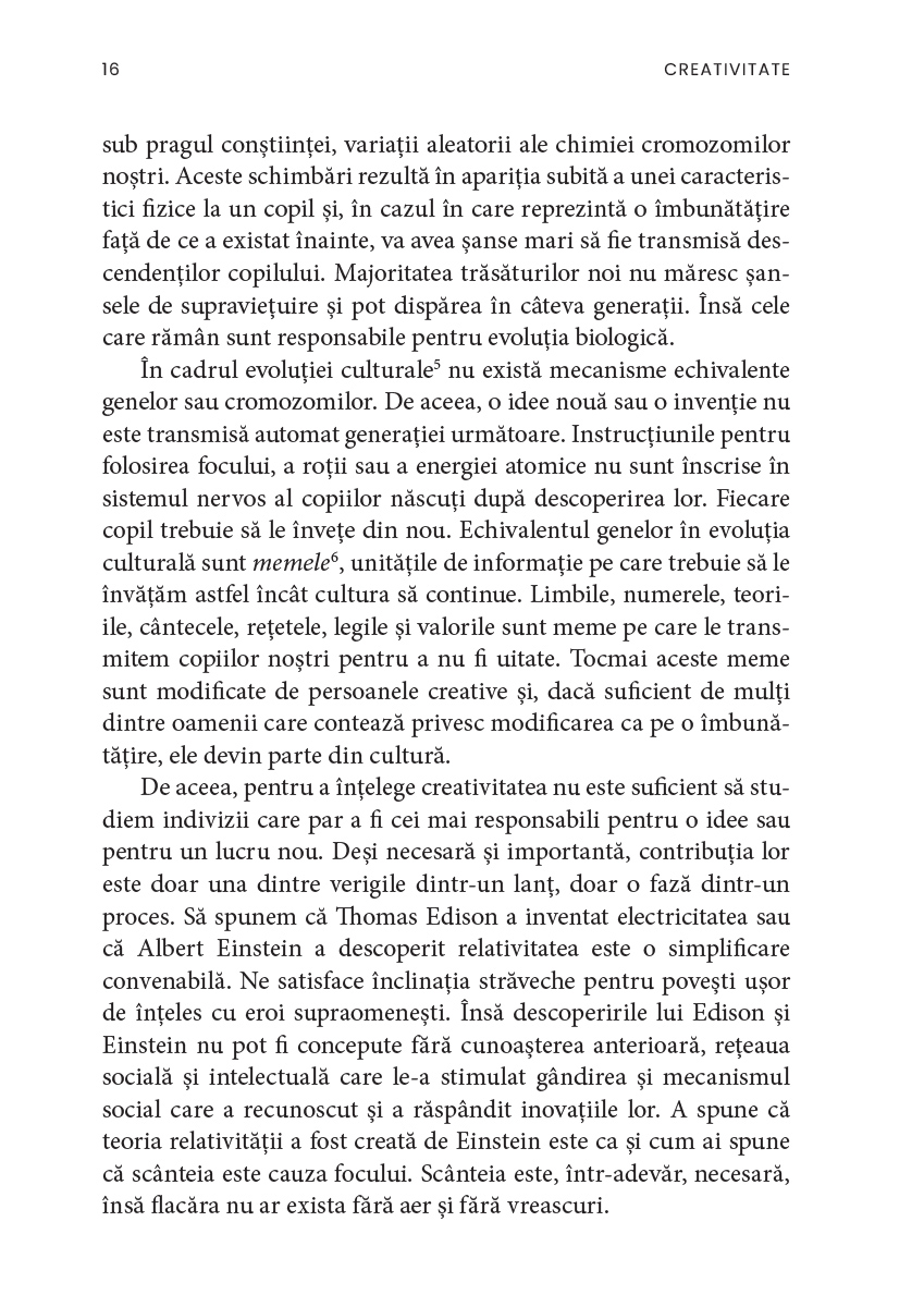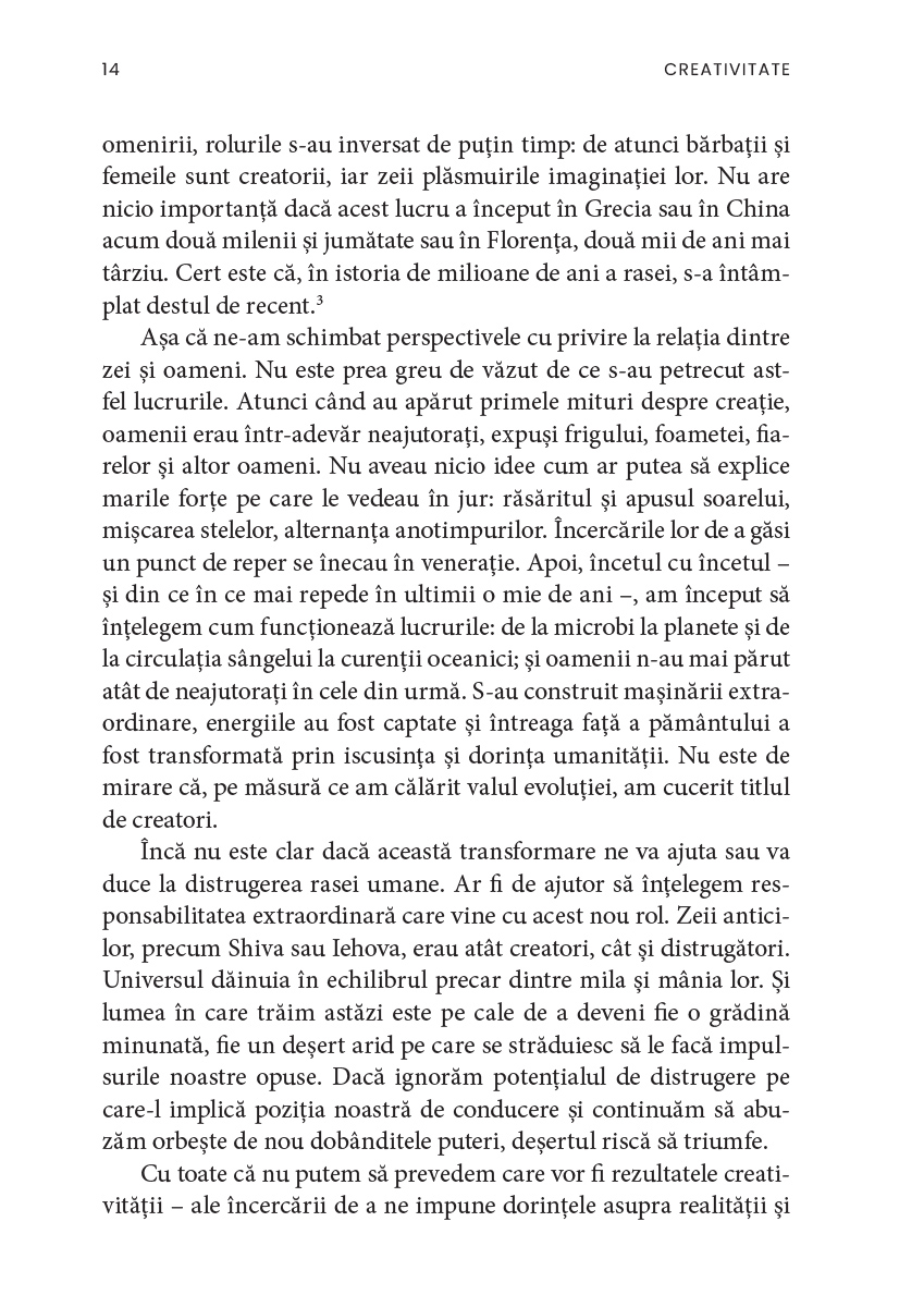 Creativitatea, ne asigură autorul, nu ține doar de domeniul artistic și nu este neapărat un atribut al excepționalității. De asemenea, există, ca și în cazul altor aptitudini, aspecte paradoxale și, uneori, întunecate, deoarece puterea de creație a fost mereu însoțită de cea de distrugere, ca în cazul bombei atomice. În acest sens, cartea de față este totodată mărturia unui umanist care își dorește ca omenirea să încline balanța spre armonie, compasiune și fericire.