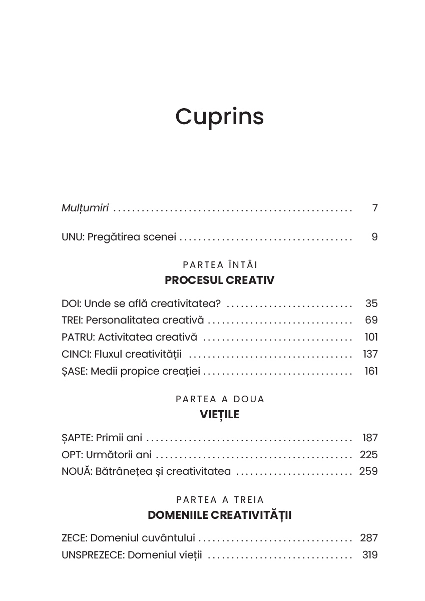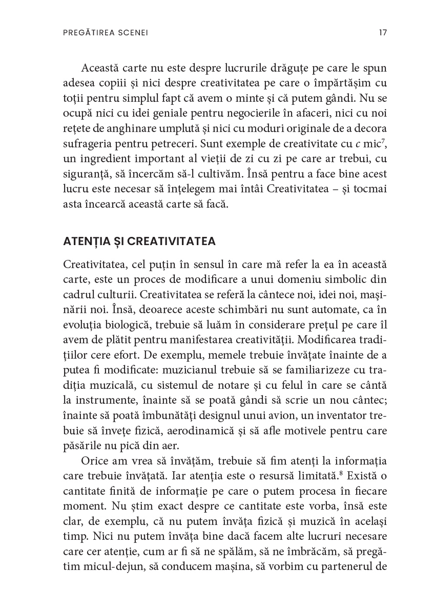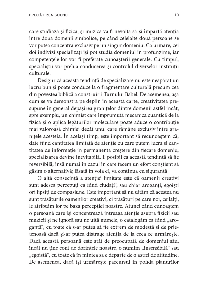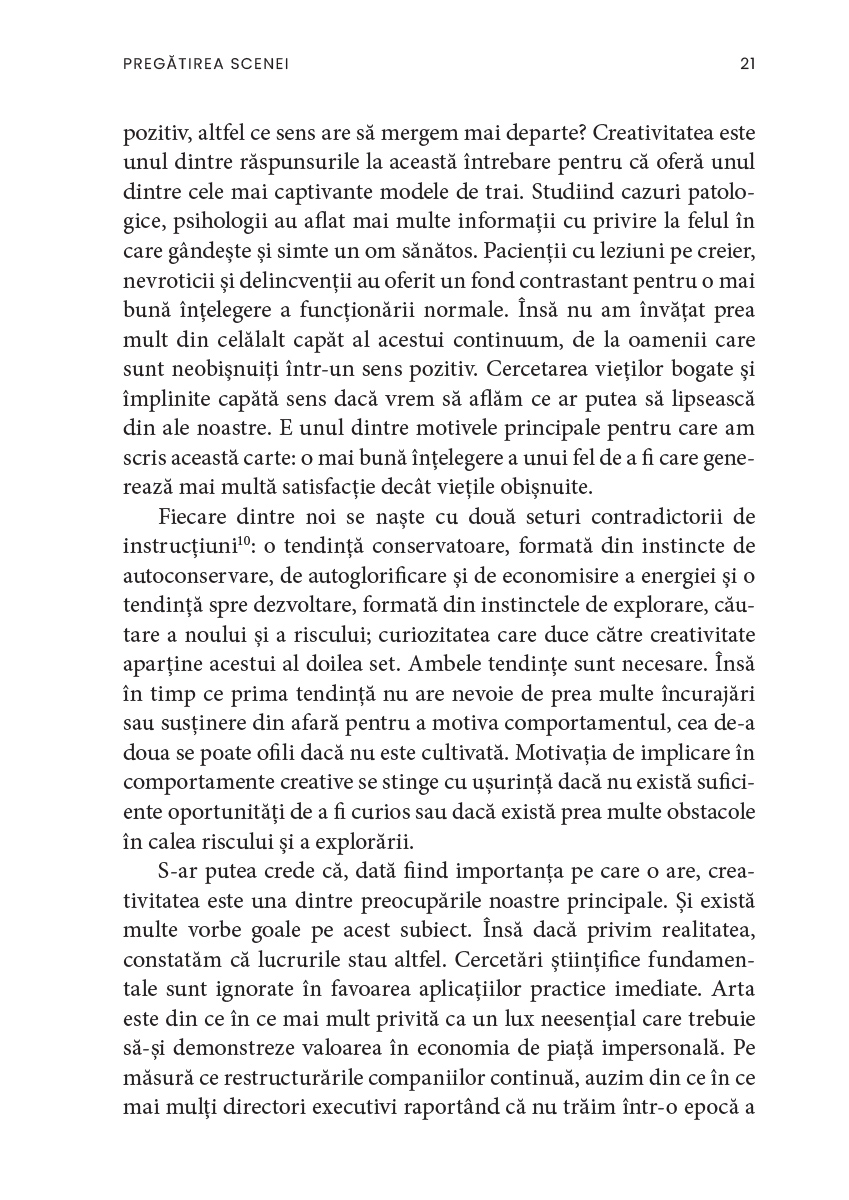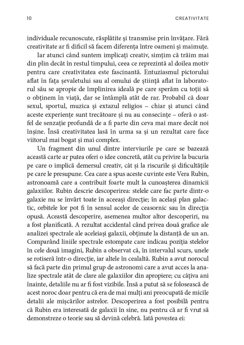 Creativitatea, ne asigură autorul, nu ține doar de domeniul artistic și nu este neapărat un atribut al excepționalității. De asemenea, există, ca și în cazul altor aptitudini, aspecte paradoxale și, uneori, întunecate, deoarece puterea de creație a fost mereu însoțită de cea de distrugere, ca în cazul bombei atomice. În acest sens, cartea de față este totodată mărturia unui umanist care își dorește ca omenirea să încline balanța spre armonie, compasiune și fericire.