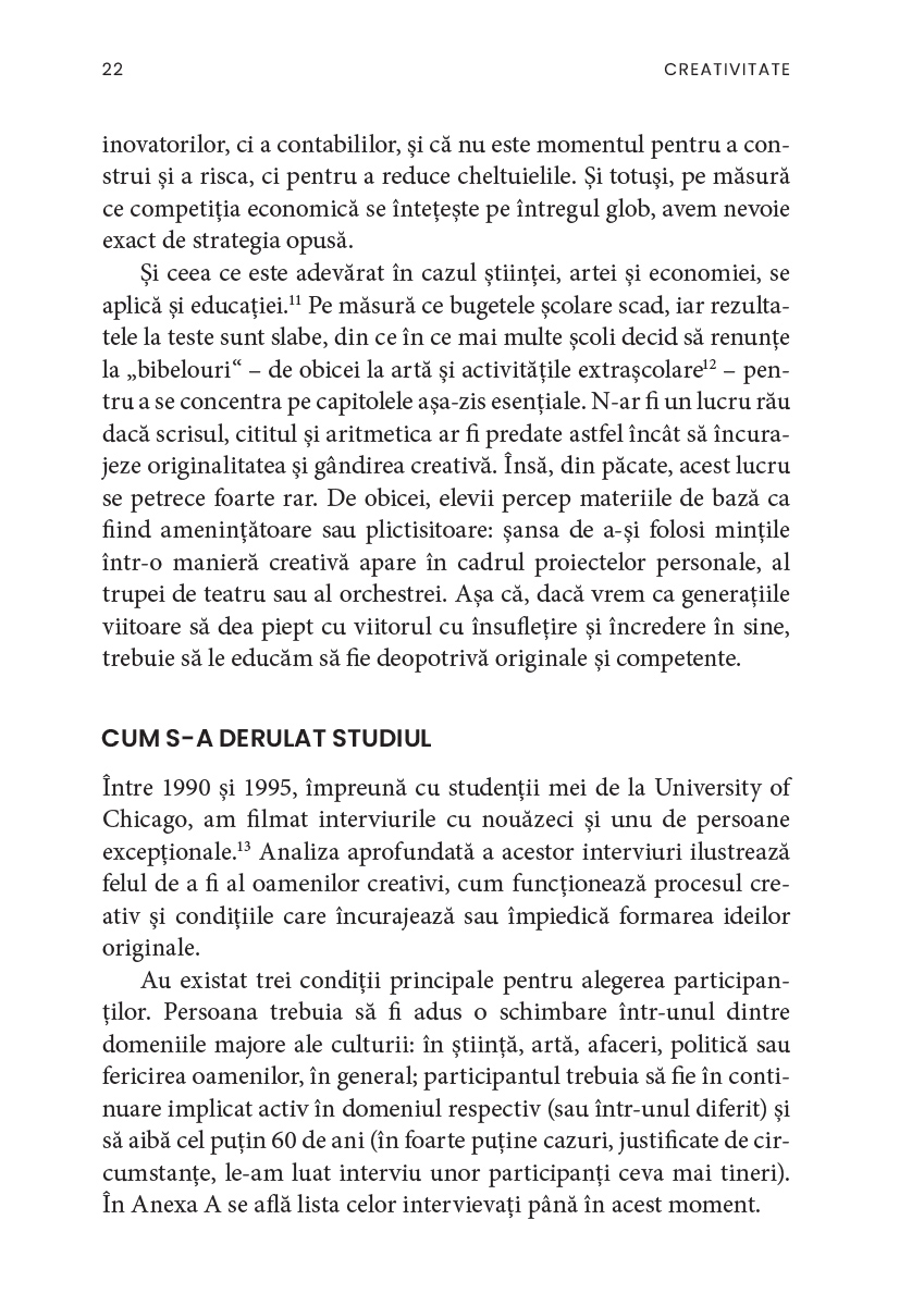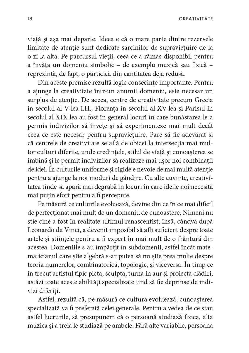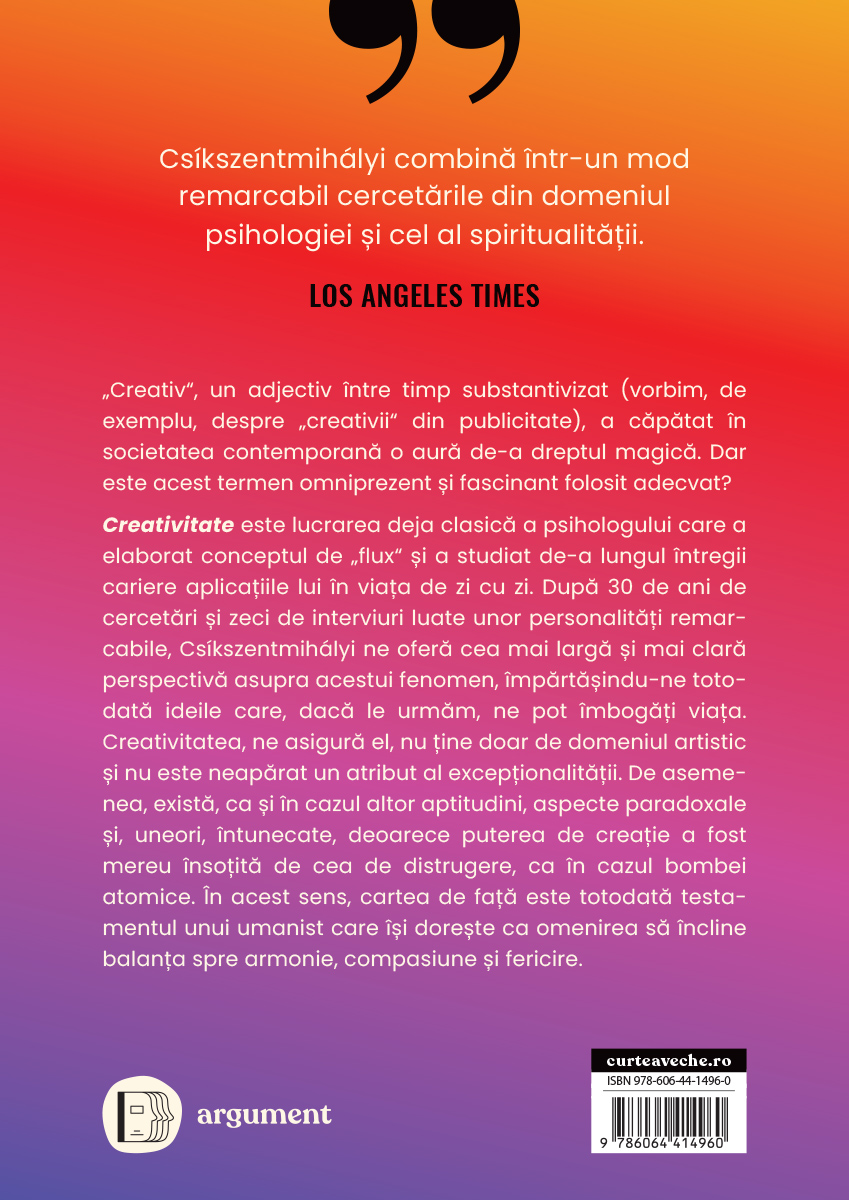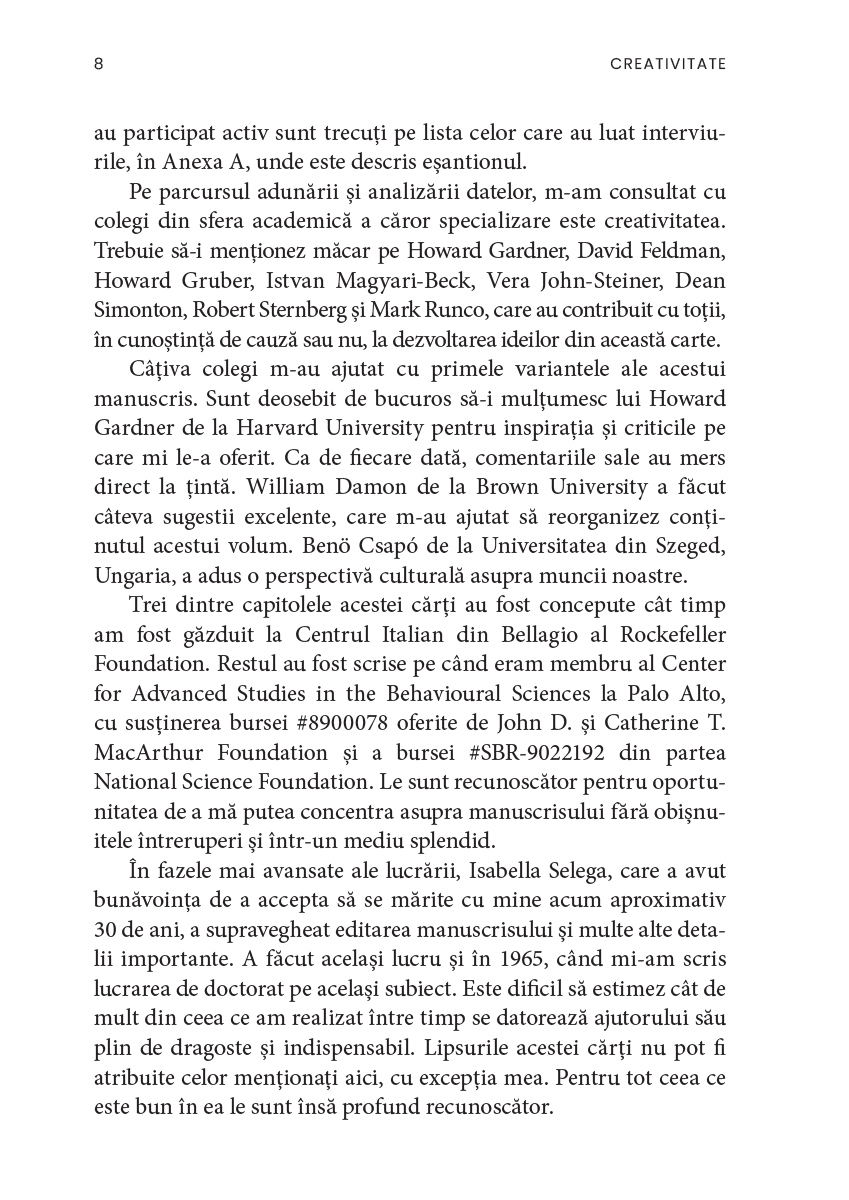 După treizeci de ani de cercetări și zeci de interviuri luate unor personalități remarcabile, Csíkszentmihályi ne oferă cea mai largă și mai clară perspectivă asupra creativității, împărtășindu-ne totodată ideile pe care, dacă le urmăm, ne putem îmbogăți viața.