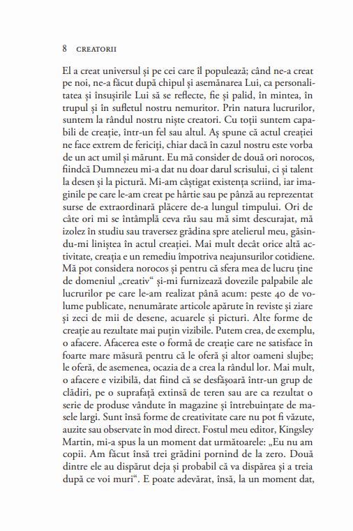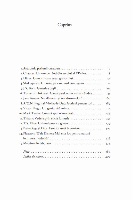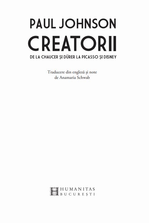 După bestsellerul Intelectualii, Paul Johnson ne propune un volum despre destinul unor oameni care s-au remarcat prin talent și originalitate. În acest demers al explorării creativității, publicistul englez se oprește asupra unor nume de referință din domenii variate: Chaucer, Shakespeare, Dürer, Pugin, Viollet-le-Duc, Bach sau Disney. Pleiada este completată de Mark Twain, americanul plin de haz care știa să se facă iubit de public când povestea o anecdotă, Victor Hugo, un geniu prolific cu o viață amoroasă tumultuoasă, sau T.S. Eliot, ultimul mare poet al modernităţii. Nu sunt uitate nici doamnele secolului al XIX-lea: Jane Austen, Madame de Staël sau George Sand, care, în pofida epocii lor, reușesc să se impună în lumea literelor. Artele plastice sunt reprezentate de Pablo Picasso, cu noua sa perspectivă vizuală, de peisagistul William Turner sau de excentricul Katsushika Hokusai. Bunul-gust și rafinamentul își găsesc expresia în creațiile lui Dior, Balenciaga și Tiffany.