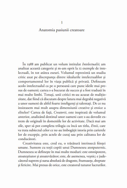 Scrisă într-un stil fluid și limpede, cartea lui Paul Johnson ne înfățișează diversele fațete ale existenței marilor creatori, lăsându-ne să anticipăm volumul următor al acestei trilogii, pe care Paul Johnson îl va dedica eroilor.
