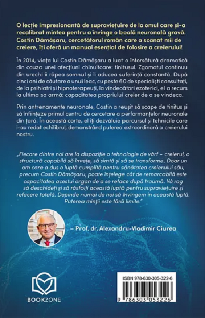 „Fiecare dintre noi are la dispoziție o tehnologie de vârf – creierul, o structură capabilă să învețe, să simtă și să se transforme. Doar un om care a dus o luptă cumplită pentru sănătatea creierului său, precum Costin Dămășaru, poate înțelege cât de remarcabilă este capacitatea acestui organ de a se reface după traumă. Vă rog să deschideți și să răsfoiți această luptă pentru supraviețuire și refacere totală. Depinde numai de noi să învingem în această luptă. Puterea minții este fără limite.”