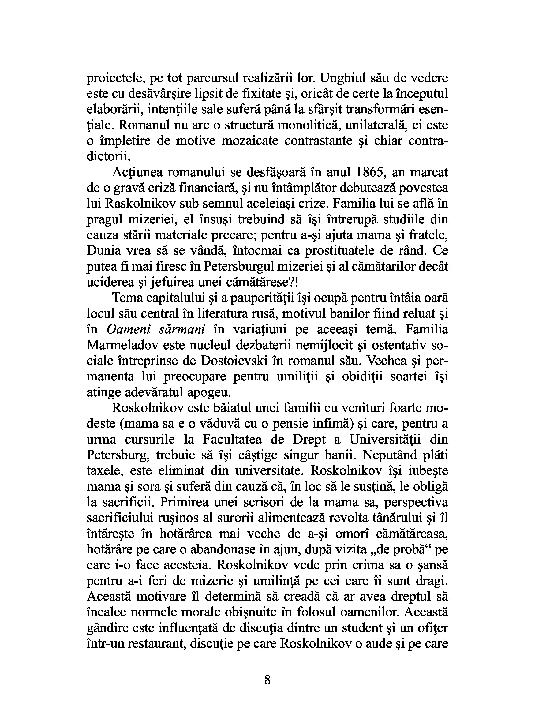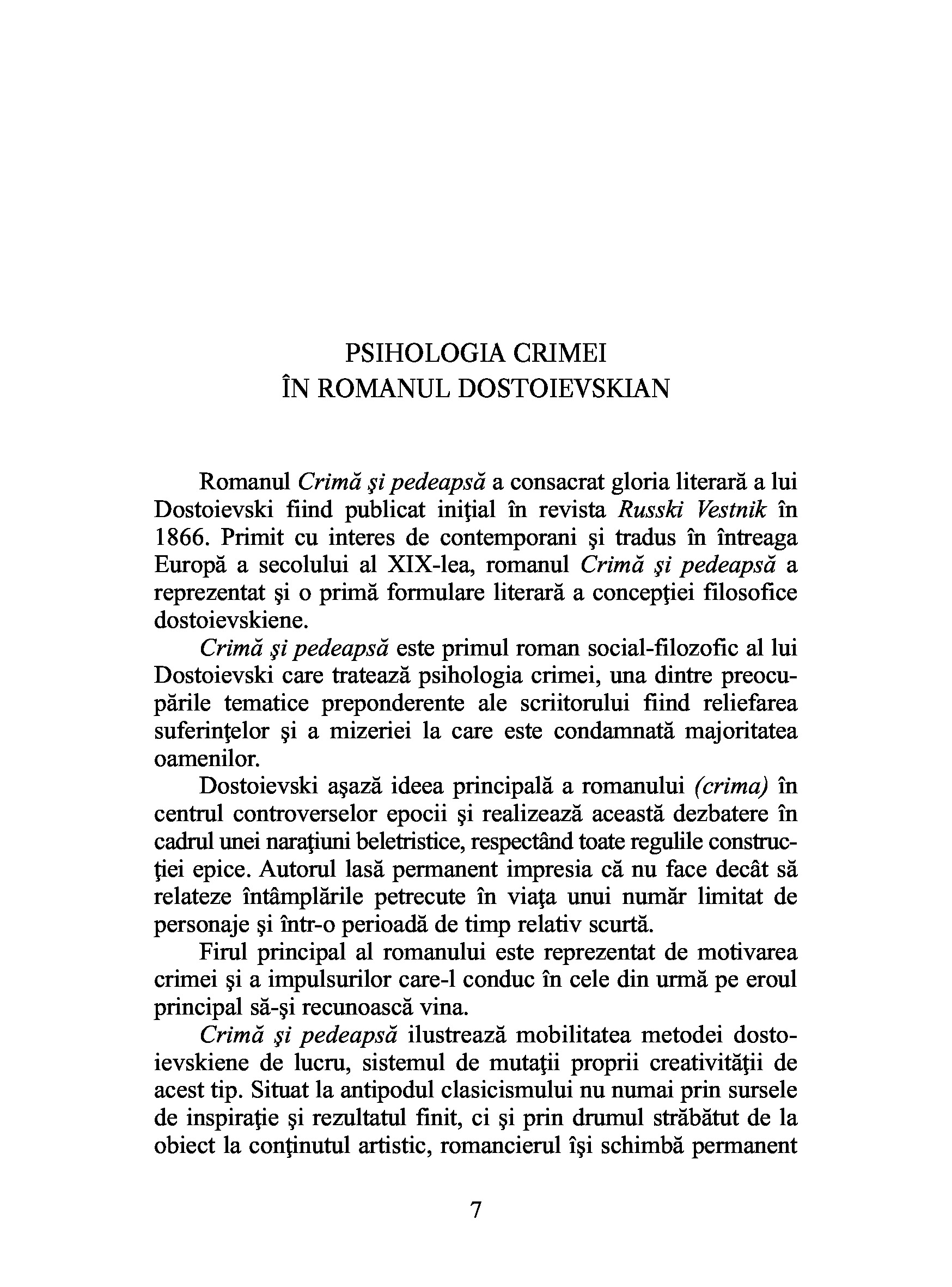Dostoievski asaza ideea principala a romanului (crima) in centrul controverselor epocii si realizeaza aceasta dezbatere in cadrul unei naratiuni, respectand toate regulile constructiei epice, lasand permanent impresia ca nu face decat sa relateze intamplarile petrecute in viata unui numar limitat de personaje intr-o perioada de timp relativ scurta.