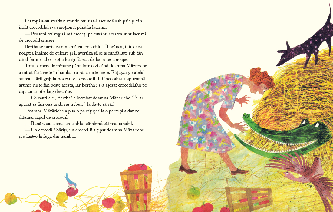 Povestea lui Roger Duvoisin are subtilitatea de a nu idealiza: nici în text, nici în ilustrații, dinții teribili ai crocodilului nu sunt ascunși. Cu alte cuvinte, e firesc să ne fie teamă de necunoscut, iar prejudecățile au uneori rostul lor, ne apără de pericole reale. Dar când încercăm să le depășim, avem șansa să ne facem prieteni buni, să cunoaștem diversitatea lumii și să ne găsim drumul în viață.