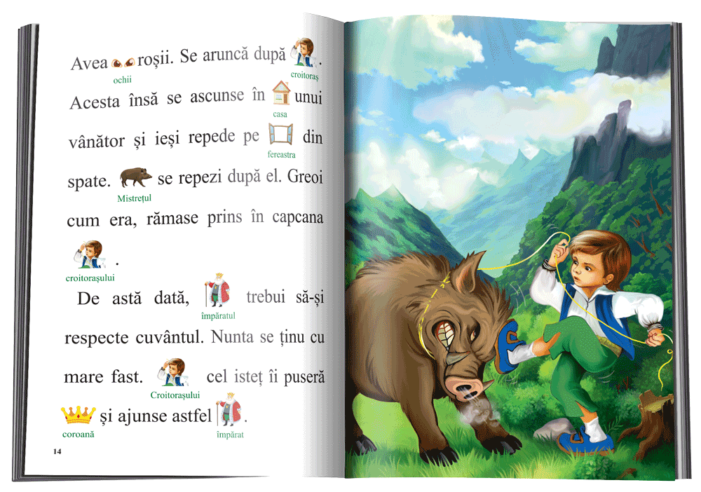 Cartea, repovestire după Frații Grimm, include ilustrații deasupra cuvintelor, pentru a ușura asocierea cuvânt-sens.