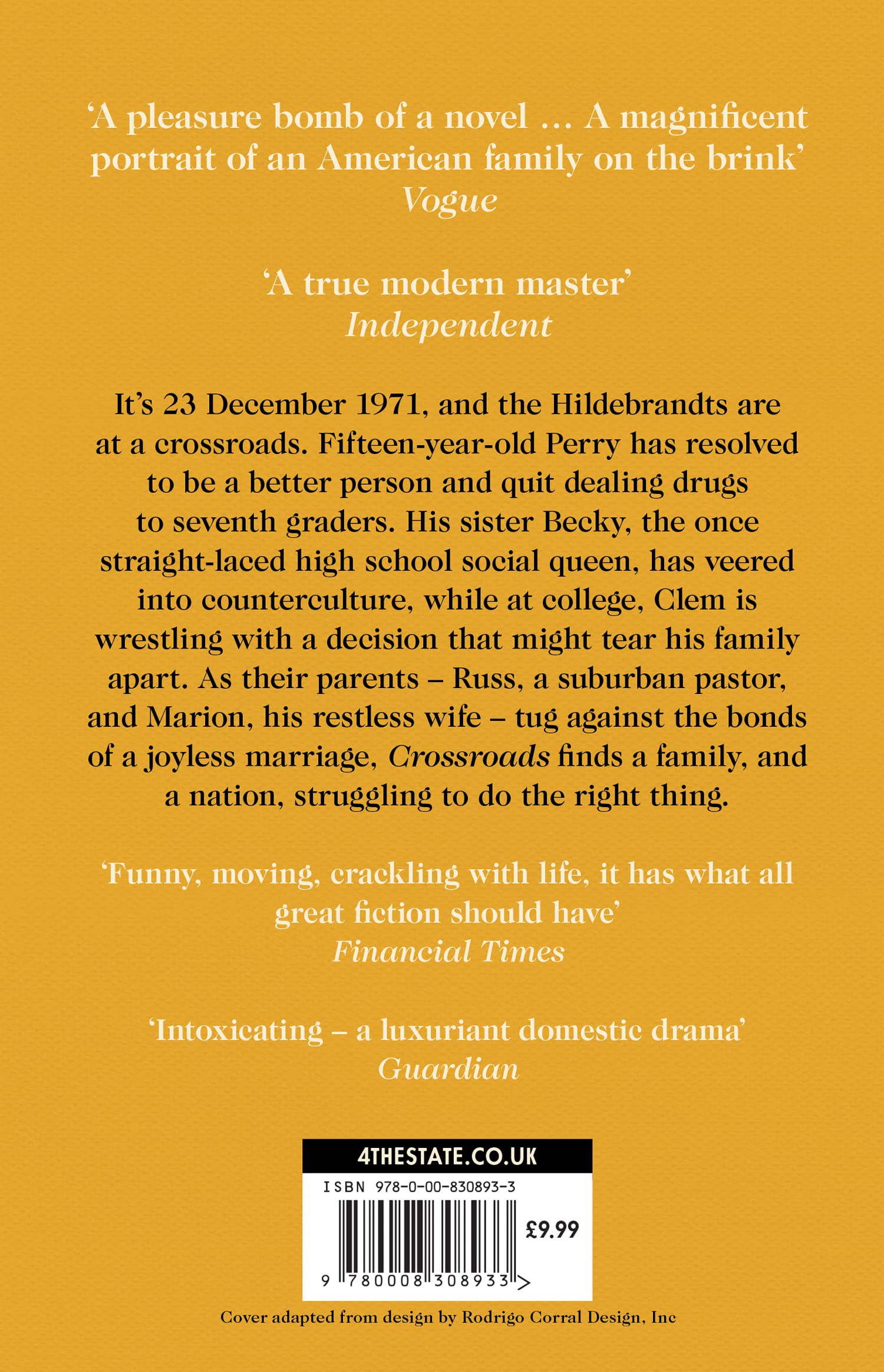 It's 23 December 1971, and the Hildebrandts are at a crossroads. Fifteen-year-old Perry has resolved to be a better person and quit dealing drugs to seventh graders. His sister Becky, the once straight-laced high school social queen, has veered into counterculture, while at college, Clem is wrestling with a decision that might tear his family apart. As their parents - Russ, a suburban pastor, and Marion, his restless wife - tug against the bonds of a joyless marriage, Crossroads finds a family, and a nation, struggling to do the right thing.