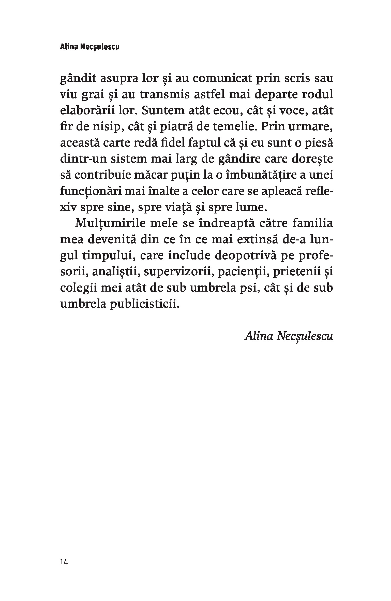 Înarmată cu perspectiva teoretică și practică a psihanalizei, Alina Necșulescu își propune să ne ajute să vedem cotidianul în altă lumină, cu nuanțe și profunzimi pe care ochiul nostru nu le-ar putea atinge fără o astfel de îndrumare.“ - Vasile Dem. Zamfirescu