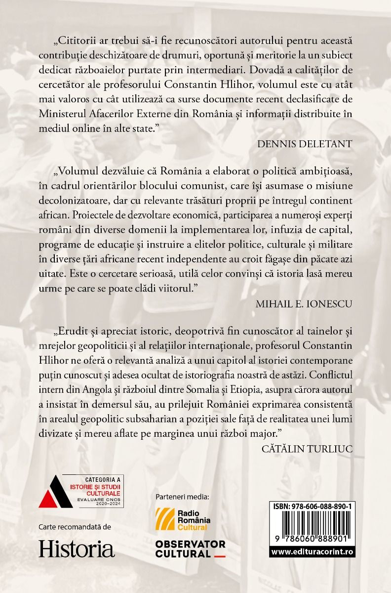 „Erudit și apreciat istoric, deopotrivă fin cunoscător al tainelor și mrejelor geopoliticii și al relațiilor internaționale, profesorul Constantin Hlihor ne oferă în prezentul volum o relevantă analiză a unui capitol al istoriei noastre contemporane puțin cunoscut și adesea ocultat de istoriografia noastră de astăzi. Conflictul intern din Angola și războiul dintre Somalia și Etiopia, asupra cărora autorul a insistat în demersul său, au prilejuit României exprimarea consistentă în arealul geopolitic subsaharian a poziției sale față de realitatea unei lumi divizate și mereu aflate pe marginea unui război major. Politica externă a României de atunci, chiar dacă marcată de un background ideologic indiscutabil, a fost una de largă deschidere și atent cumpănită moderație, cu extensiune deopotrivă spre pragmatism și spre considerente de ordin politico-ideologic.”