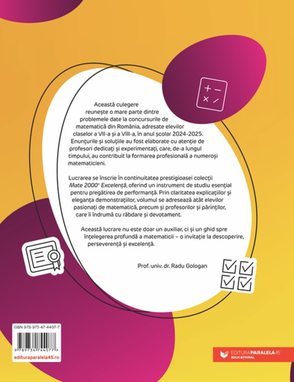 Această lucrare nu este doar un auxiliar, ci și un ghid spre înțelegerea profundă a matematicii – o invitație la descoperire, perseverență și excelență. -- Prof. univ. dr. Radu Gologan