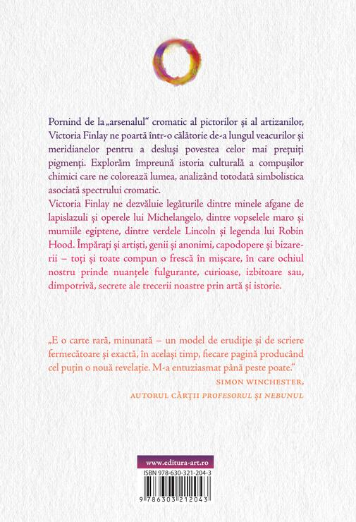 Victoria Finlay ne dezvăluie legăturile dintre minele afgane de lapislazuli și operele lui Michelangelo, dintre vopselele maro și mumiile egiptene, dintre verdele Lincoln și legenda lui Robin Hood. Împărați și artiști, genii și anonimi, capodopere și bizarerii – toți și toate compun o frescă în mișcare, în care ochiul nostru prinde nuanțele fulgurante, curioase, izbitoare sau, dimpotrivă, secrete ale trecerii noastre prin artă și istorie.