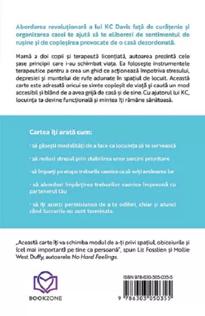 Această carte este adresată oricui se simte copleșit de viață și caută un mod accesibil și blând de a avea grijă de casă și de sine. Autoarea folosește instrumentele terapeutice pentru a crea un ghid ce acționează împotriva stresului, depresiei și muntelui de rufe adunate în spațiul de locuit. Cu ajutorul lui KC Davis, locuința ta devine funcțională și mintea îţi rămâne sănătoasă.