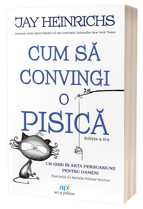 um să convingi o pisică: Un ghid în arta persuasiunii pentru oameni / How to Argue with a Cat: A Human's Guide to the Art of Persuasion de Jay Heinrichs este o carte scrisă în cheie amuzantă despre un subiect foarte serios: persuasiunea. Așadar, dacă vrei să fii convingător, mai convingător sau extrem de convingător, ai deschis cartea care trebuie. Și nu, cartea nu te învață să convingi pisicile, ci oamenii, doar că autorul s-a inspirat puțin din lumea felinelor pentru a ne furniza cele mai bune secrete de a convinge pe oricine, inclusiv o... pisică. Asta pentru că, crede el, dacă poți convinge o pisică, vei putea convinge practic pe oricine.