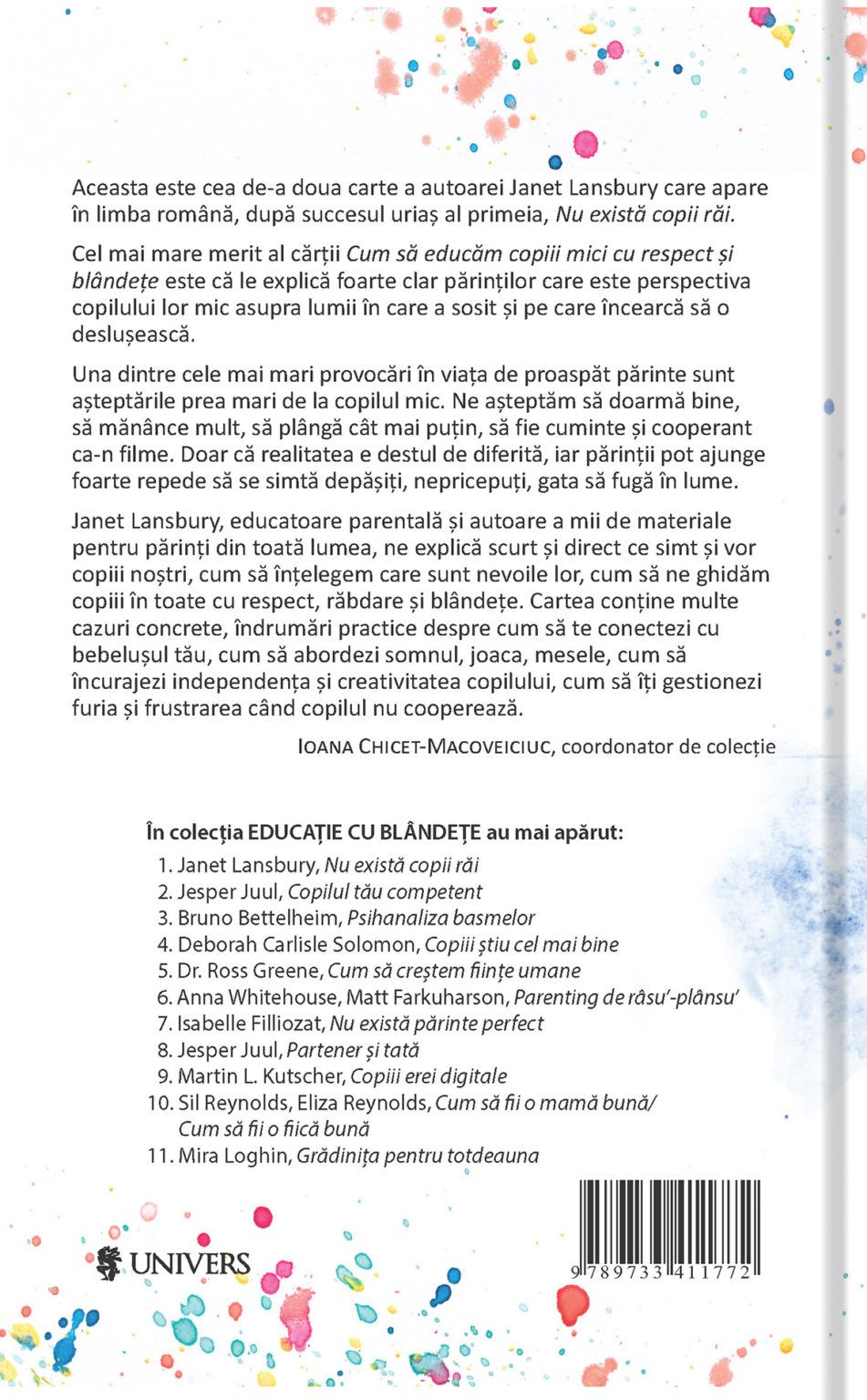 Janet Lansbury, educator parental și autoare a mii de materiale pentru părinți din toată lumea, ne explică scurt și direct ce simt și vor copiii noștri, cum să înțelegem care sunt nevoile lor, cum să ne ghidăm copiii în toate cu respect, răbdare și blândețe. Cartea conține multe cazuri concrete, îndrumări practice despre cum să te conectezi cu bebelușul tău, cum să abordezi somnul, mesele, joaca, cum să încurajezi independența și creativitatea copilului, cum să îți gestionezi furia și frustrarea când copilul nu cooperează.
