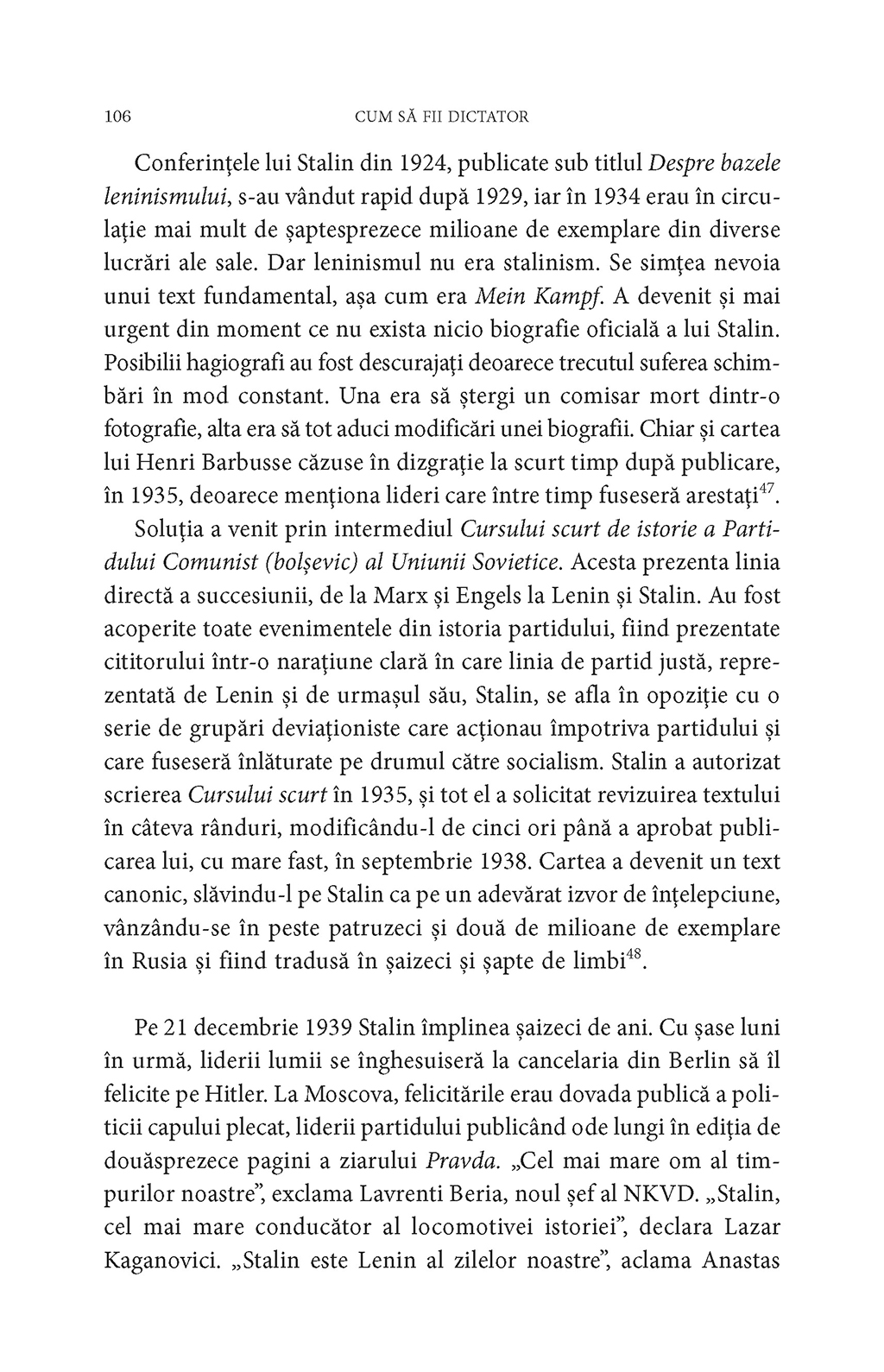 „Într‑un depozit administrat de primăria din Addis Abeba, Lenin stă întins pe spate, între buruieni şi canistre goale de ulei. Puţini mai vin să‑l viziteze. Iar cei care o fac sînt avertizaţi de muncitori să nu îl trezească. E mare şi greu, iar coborîrea lui de pe piedestal a fost dificilă. A fost nevoie de maşini de mare tonaj, pentru că frînghiile n‑au reuşit nici măcar să‑l facă să tremure. După căderea Zidului Berlinului în noiembrie 1989, Lenin a fost demontat de mii de ori, uneori atacat cu pietre sau decapitat, alteori lăsat în plata Domnului. Decenii la rînd, portretele, afişele, sloganurile, busturile şi statuile au fost la mare căutare, dar acum tendinţa se inversa. Pe mulţi, asta i‑a surprins. Se gîndeau că dictatorii, la fel ca statuile lor, erau de neurnit. Părea că reuşiseră să ajungă la sufletele oamenilor şi că le modelaseră gîndirea. Pogorîseră parcă o vrajă peste oameni. Dar n‑a fost niciodată vorba de aşa ceva. A fost vorba de frică, iar cînd frica a dispărut, întregul edificiu s‑a prăbuşit. În cazul lui Ceauşescu, căderea lui în faţa demonstranţilor adunaţi în faţa sediului partidului pe 21 decembrie 1989 poate fi urmărită minut cu minut. Dar a fost nevoie de cîteva decenii pentru ca acea clipă să sosească.” (Frank Dikötter)
