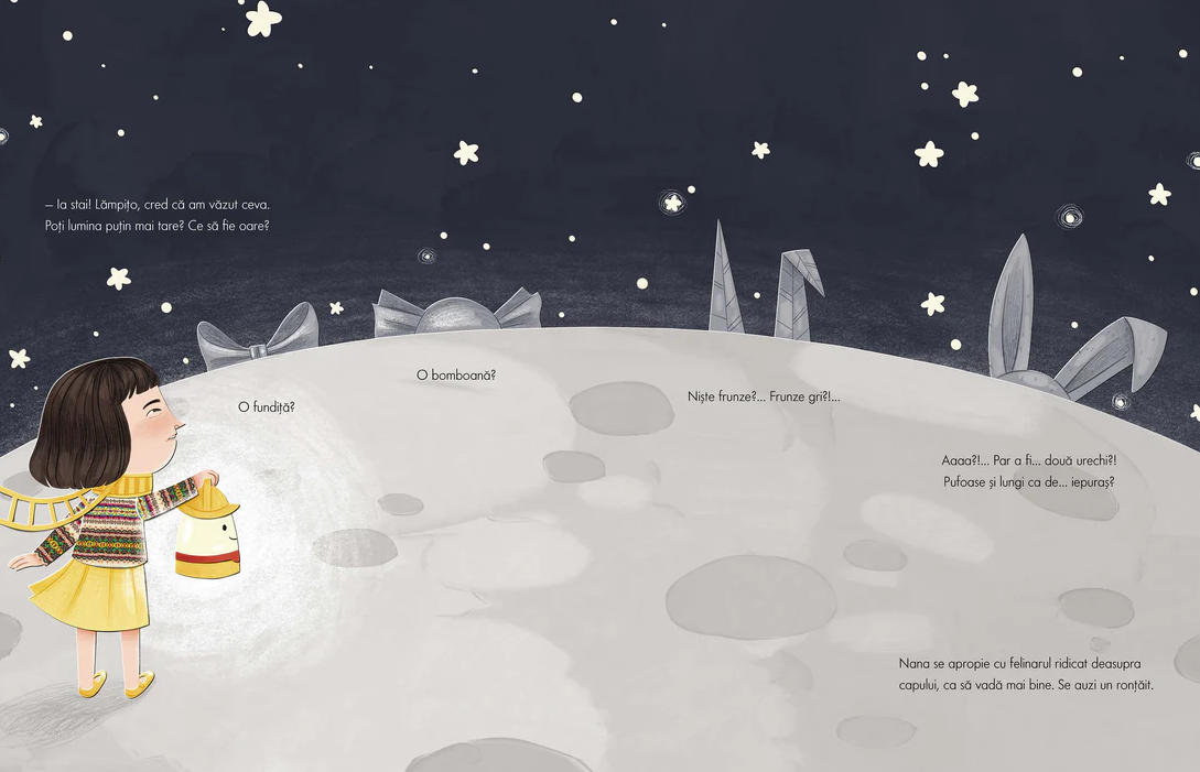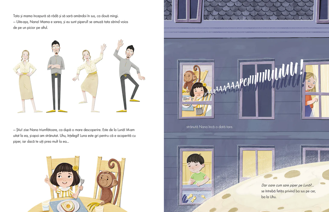 Micuța Nana crede că strănută din cauza Lunii, care este acoperită de piper. Așa că, însoțită de maimuțica ei de pluș, camarad nelipsit de aventuri, pleacă într-o expediție, ca să lămurească misterul. Dar acolo îl întâlnește pe iepurele din Lună, care-i povestește cum luminează încă stelele, deși au dispărut demult. O poveste fascinantă care are la bază o veche legendă japoneză.