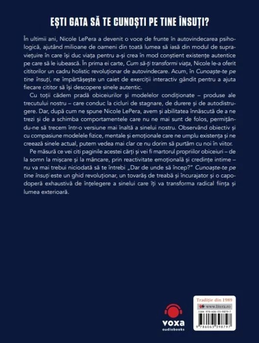 În ultimii ani, Nicole LePera a devenit o voce de frunte în autovindecarea psihologică, ajutând milioane de oameni din toată lumea să iasă din modul de supraviețuire în care își duc viața pentru a-și crea în mod conștient existențe autentice pe care să le iubească. În prima ei carte, Cum să-ți transformi viața, Nicole le-a oferit cititorilor un cadru holistic revoluționar de autovindecare. Acum, în Cunoaște-te pe tine însuți, ne împărtășește un caiet de exerciții interactiv gândit pentru a ajuta fiecare cititor să își descopere sinele autentic.