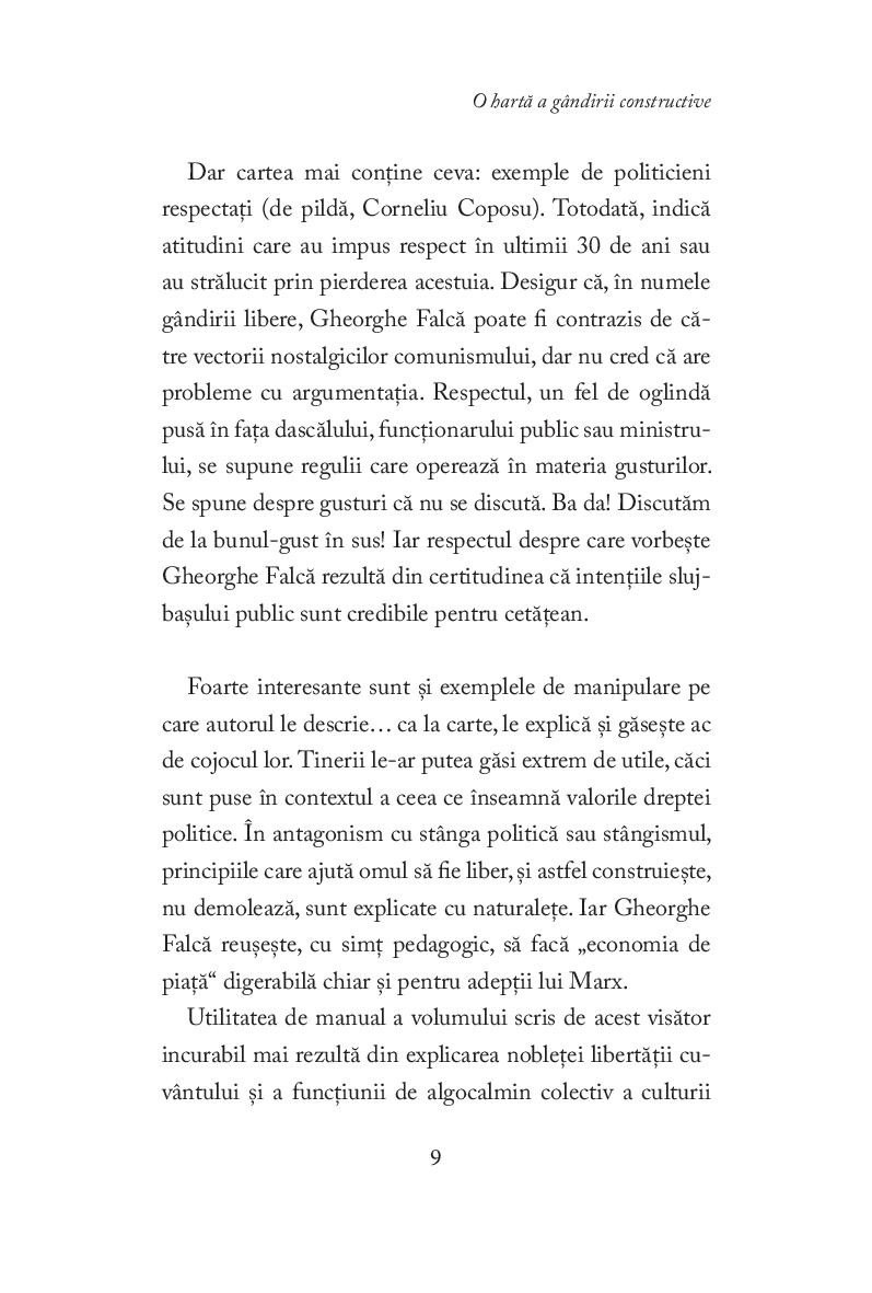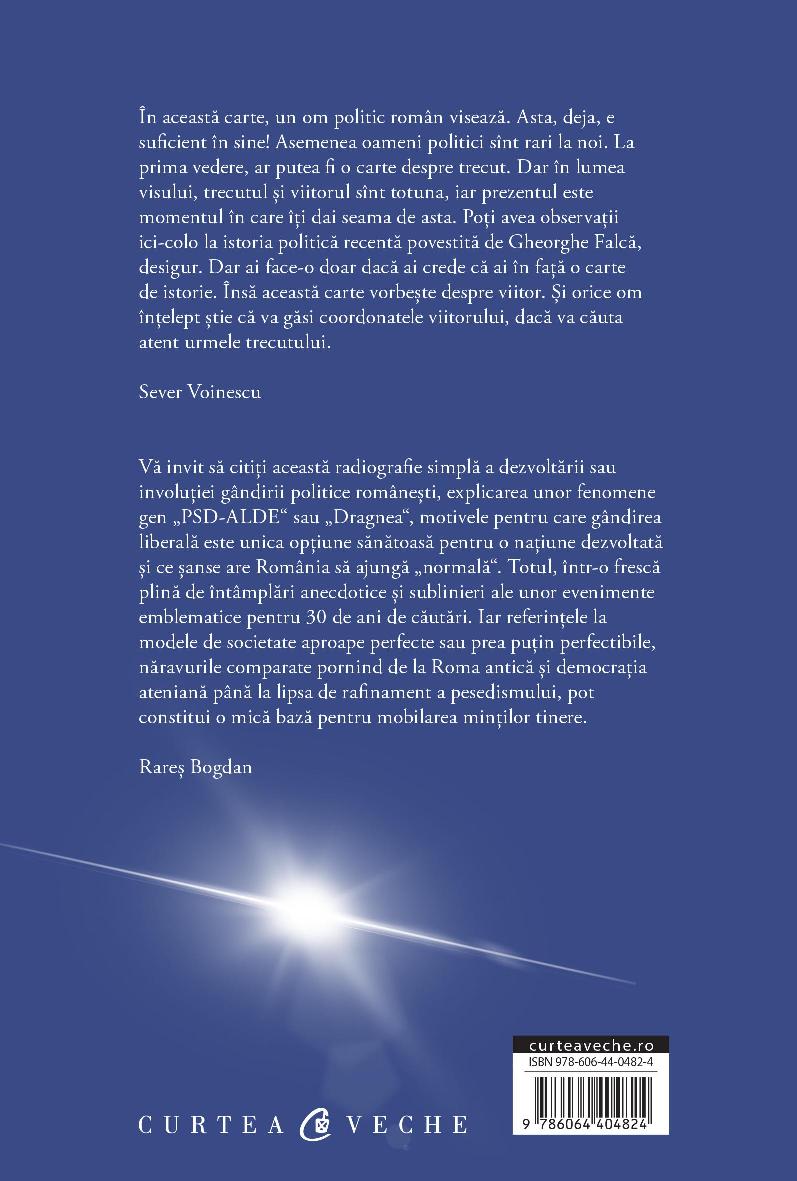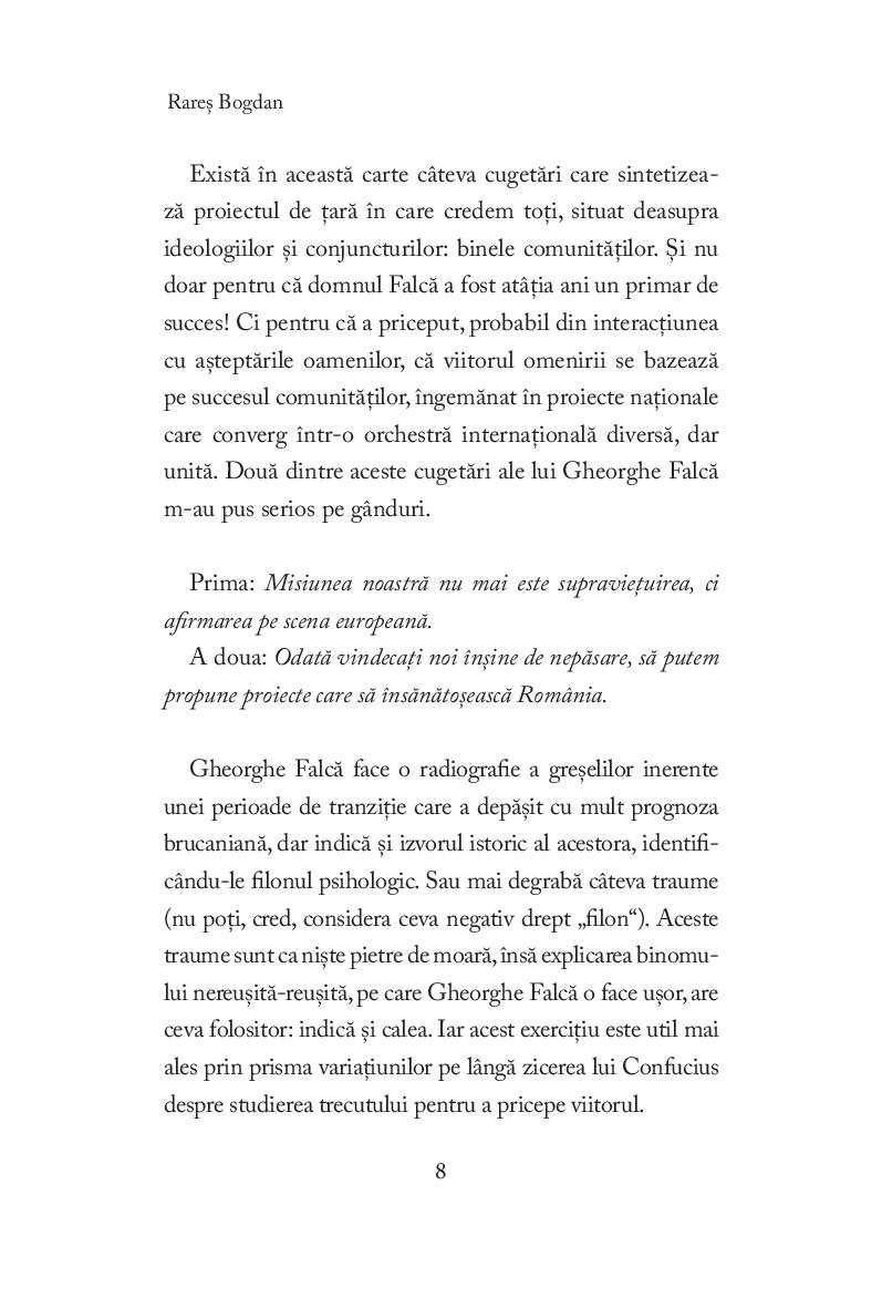 În această carte, un om politic român visează. Asta, deja, e suficient în sine! Asemenea oameni politici sînt rari la noi. La prima vedere, ar putea fi o carte despre trecut. Dar în lumea visului, trecutul și viitorul sînt totuna, iar prezentul este momentul în care îți dai seama de asta. Poți avea observații ici-colo la istoria politică recentă povestită de Gheorghe Falcă, desigur. Dar ai face-o doar dacă ai crede că ai în față o carte de istorie. Însă această carte vorbește despre viitor. Și orice om înțelept știe că va găsi coordonatele viitorului, dacă va căuta atent urmele trecutului. - Sever Voinescu