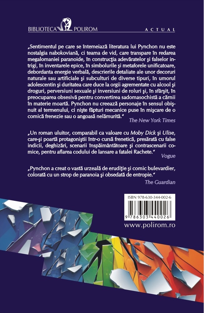 Dar asta este doar o piesă a marelui puzzle şi, aşa cum aflăm curând, fiecare eveniment din intriga infinit de complicată a romanului, oricât de izolat ar părea, este conectat la o reţea de dimensiuni colosale, ţelul suprem fiind acela de-a arunca lumea în aer cu o ultimă rachetă devastatoare. Ca întotdeauna în cărţile lui Pynchon, nu există un singur fir narativ, o singură poveste, ci o proliferare de personaje şi evenimente care torturează şi fascinează cititorul cu sugestii, referinţe, calambururi şi bancuri, punându‑i la încercare puterea de înţelegere.