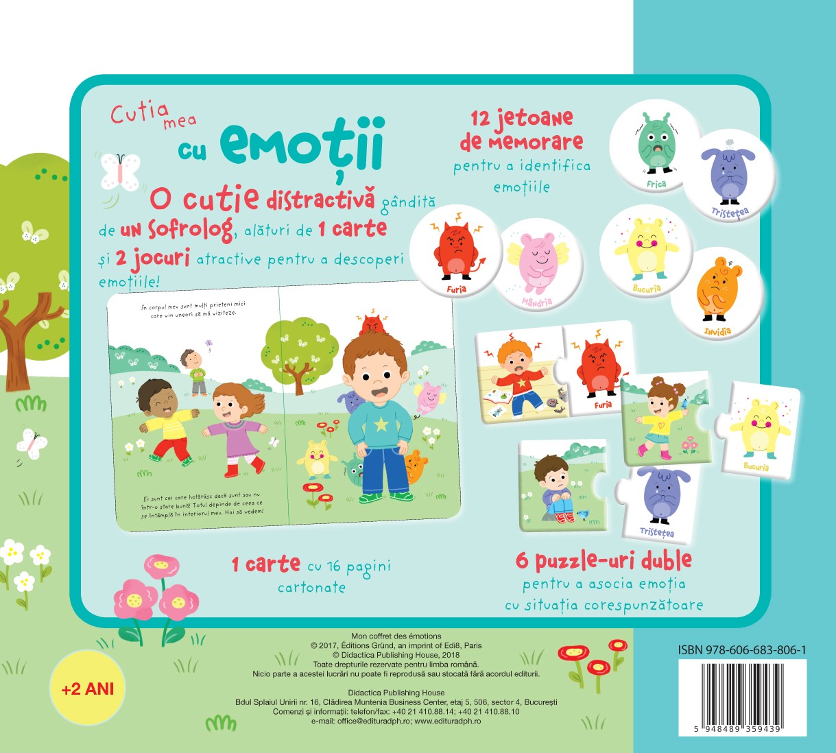 O cutie distractivă gândită de un sofrolog, alături de 1 carte și 2 jocuri atractive pentru a descoperi emoțiile!