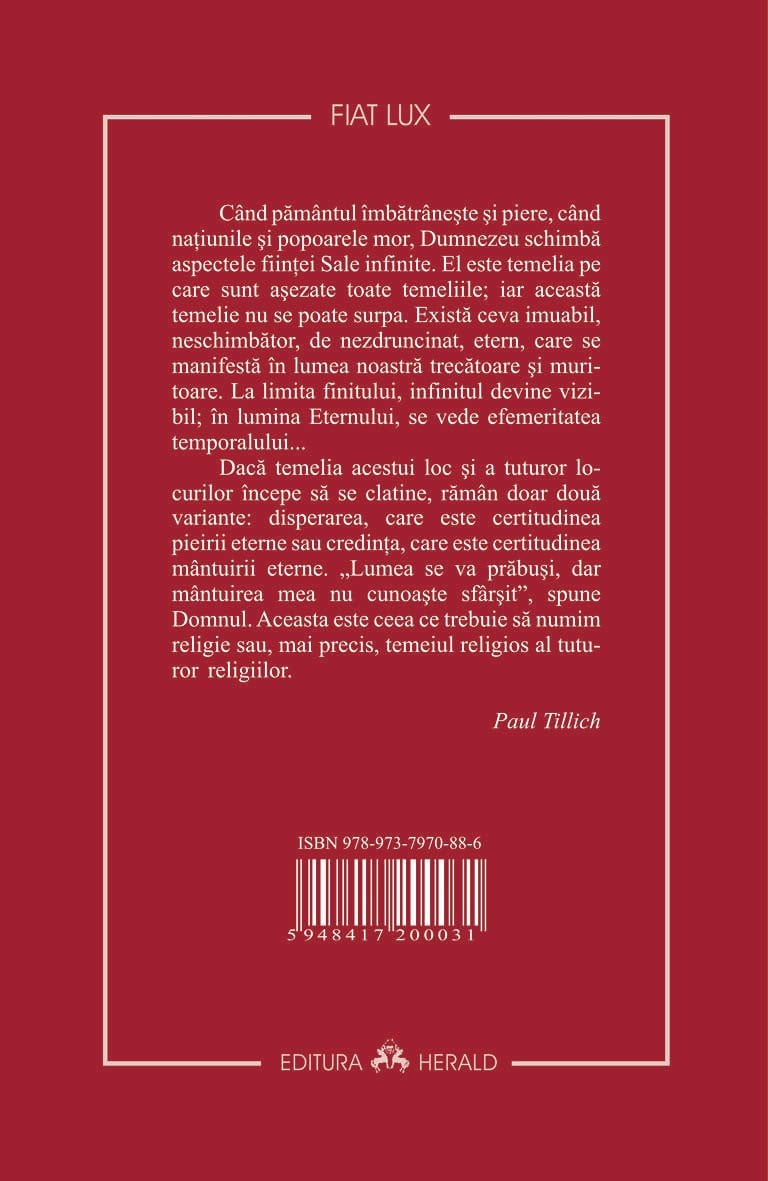 "Cand pamantul imbatraneste si piere, cand natiunile si popoarele mor, Dumnezeu schimba aspectele fiintei Sale infinite. El este temelia pe care sunt asezate toate temeliile; iar aceasta temelie nu se poate surpa. Exista ceva imuabil, neschimbator, de nezdruncinat, etern, care se manifesta in lumea noastra trecatoare si muritoare. La limita finitului, infinitul devine vizibil; in lumina Eternului, se vede efemeritatea temporalului.... Daca temelia acestui loc si a tuturor locurilor incepe sa se clatine, raman doar doua variante: disperarea, care este certitudinea pieirii eterne sau credinta, care este certitudinea mantuirii eterne. "Lumea se va prabusi, dar mantuirea mea nu cunoaste sfarsit", spune Domnul. Aceasta este ceea ce trebuie sa numim religie sau, mai precis, temeiul religios al tuturor religiilor".