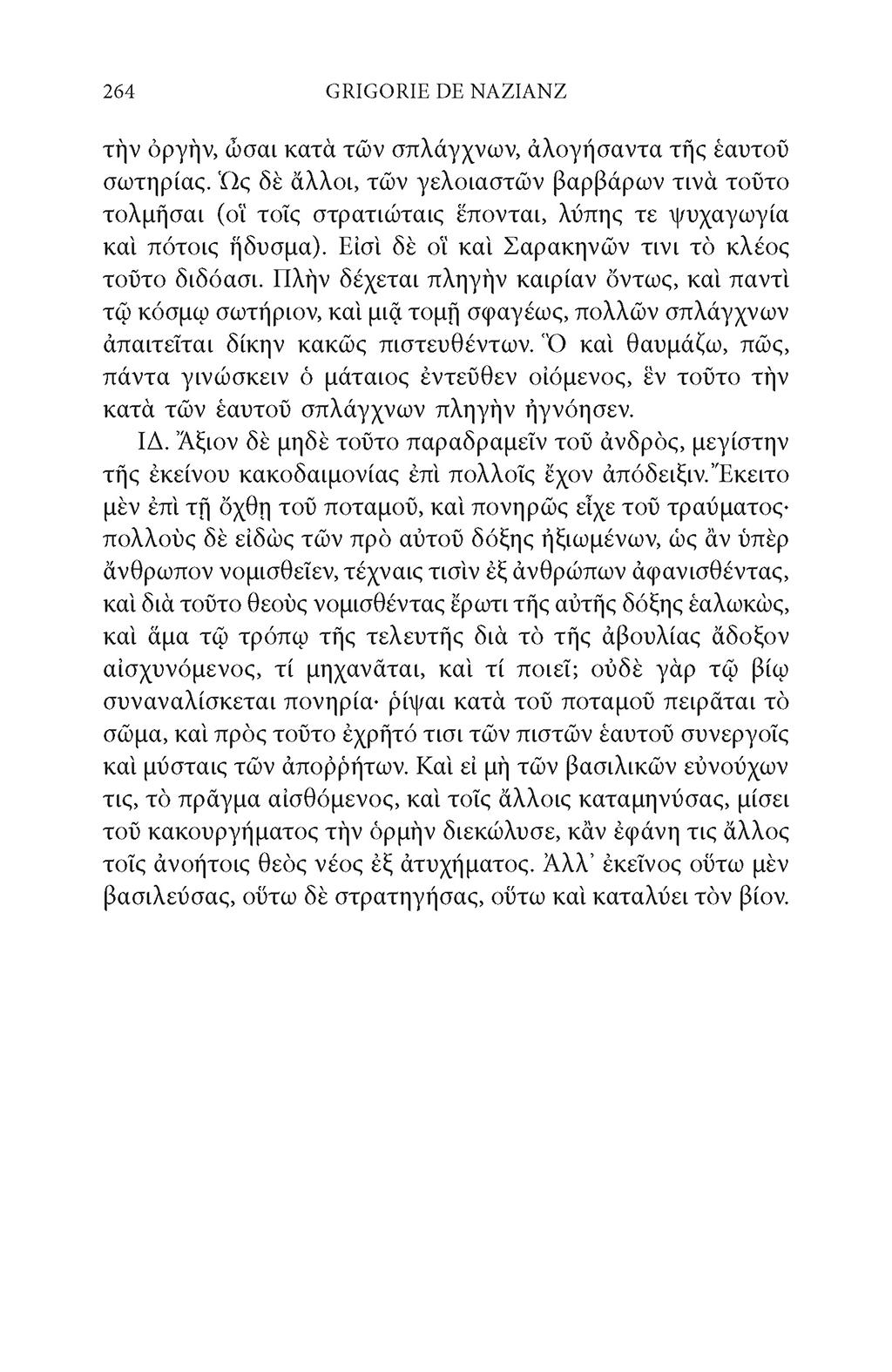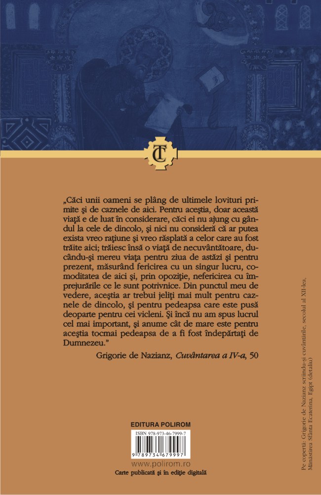 „Căci unii oameni se plîng de ultimele lovituri primite și de caznele de aici. Pentru aceștia, doar această viață e de luat în considerare, căci ei nu ajung cu gîndul la cele de dincolo, și nici nu consideră că ar putea exista vreo rațiune și vreo răsplată a celor care au fost trăite aici; trăiesc însă o viață de necuvîntătoare, ducîndu‑și mereu viața pentru ziua de astăzi și pentru prezent, măsurînd fericirea cu un singur lucru, comoditatea de aici și, prin opoziție, nefericirea cu împrejurările ce le sînt potrivnice. Din punctul meu de vedere, aceștia ar trebui jeliți mai mult pentru caznele de dincolo, și pentru pedeapsa care este pusă deoparte pentru cei vicleni. Și încă nu am spus lucrul cel mai important, și anume cît de mare este pentru aceștia tocmai pedeapsa de a fi fost îndepărtați de Dumnezeu.” (Grigorie de Nazianz, Cuvîntarea a IV-a, 50)