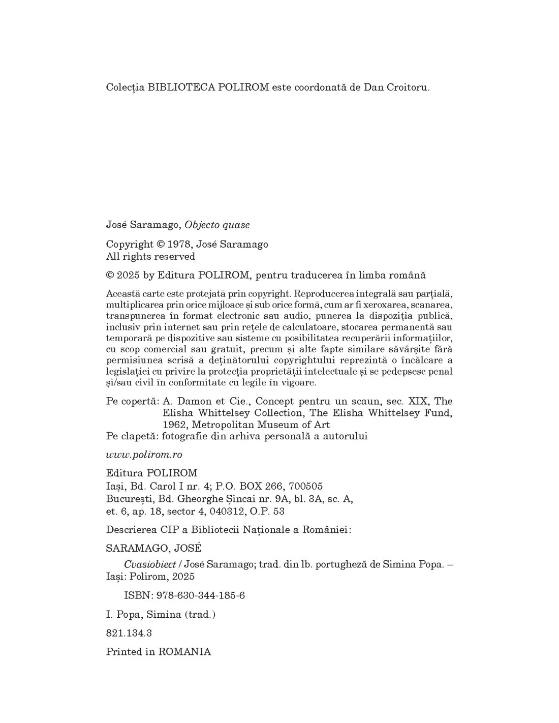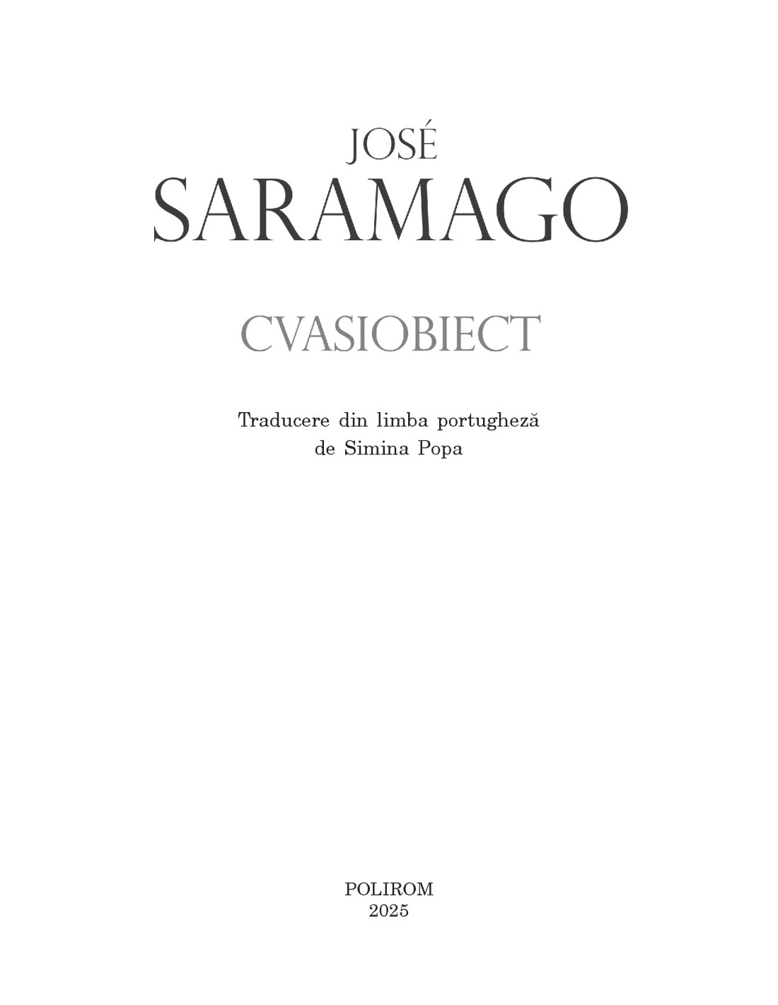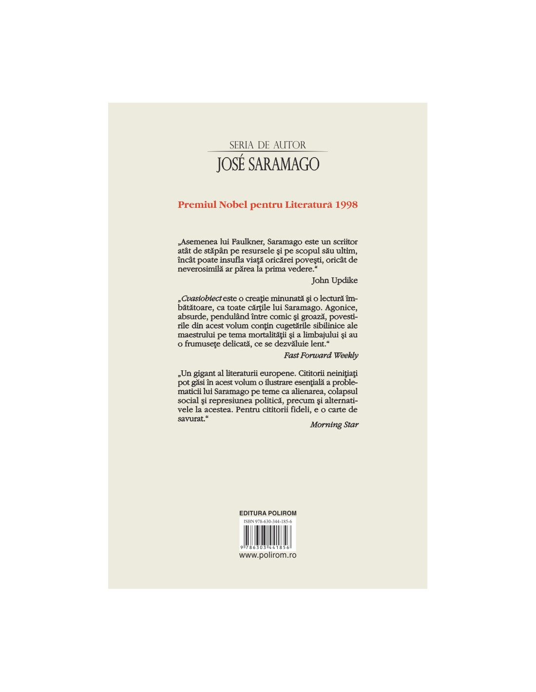 Combinaţie de satiră amară, parodie şocantă şi halucinaţie bizară, Cvasiobiect marchează debutul lui José Saramago în proza scurtă.