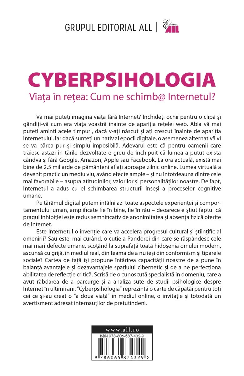 Categoric, pe fondul existenței pe o scenă virtuală s-a format o relație cu totul nouă între noi și propriile noastre acțiuni. În cazul în care trecem încontinuu de la viața reală la spațiul cibernetic și înapoi, percepția iluzorie nu poate fi o simplă excepție. Imaginea de ansamblu intră într-o zonă tulbure. Pentru a evita să cădem prea des în capcanele Internetului, trebuie să devenim conștienți de modul în care se răsfrânge permanenta pendulare între viața reală și habitatul virtual asupra identității, emoțiilor și comportamentului nostru. Bazată pe sute de studii psihologice despre Internet și pe noțiuni fundamentale din domeniul psihologiei, cartea ne învață cum să punem în balanță avantajele și dezavantajele spațiului cibernetic. Autoarea ne ajută să descoperim resorturile care ne afectează rațiunea și emoțiile atunci când suntem online. În același timp, ne prezintă și căile prin care putem deveni internauți competenți.