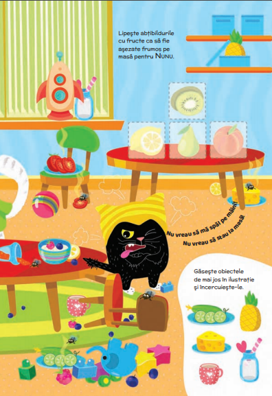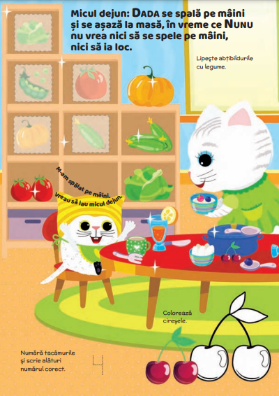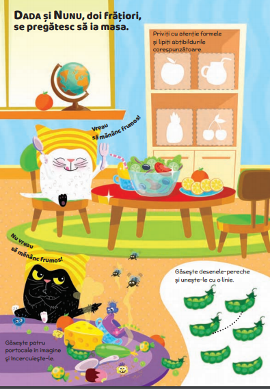 Faceţi cunoştinţă cu Dada şi Nunu, doi pisoi simpatici şi cu personalităţi pe cât de puternice, pe atât de diferite: în vreme de Dada e înţelegător, Nunu e cam îndărătnic. Mami însă îi iubeşte la fel de mult şi încearcă să le dea amândurora lecţii de folos în viaţă. De data aceasta, Dada şi Nunu învaţă cum să stea frumos la masă după ce s-au spălat pe mâini şi ce e bine şi ce nu să mănânce. Pentru că, se ştie, dacă nu te speli cu mare atenţie pe mâini şi nu mănânci mâncare sănătoasă şi proaspătă, te doare burtica, aşa cum i s-a întâmplat lui Nunu. Noroc că Dada şi mami au avut grijă de el şi l-au pus iute pe picioare. Copiii învaţă cel mai bine cu ajutorul exemplelor şi al activităţilor, de aceea aventurile lui Dada şi Nunu sunt cea mai convingătoare şi atrăgătoare cale de a le povesti celor mici câte ceva despre sănătate.