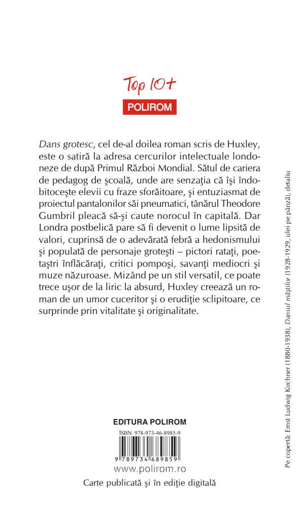 Dans grotesc, cel de-al doilea roman scris de Huxley, este o satiră la adresa cercurilor intelectuale londoneze de după Primul Război Mondial. Sătul de cariera de pedagog de şcoală, unde are senzaţia că îşi îndobitoceşte elevii cu fraze sforăitoare, şi entuziasmat de proiectul pantalonilor săi pneumatici, tânărul Theodore Gumbril pleacă să-şi caute norocul în capitală. Dar Londra postbelică pare să fi devenit o lume lipsită de valori, cuprinsă de o adevărată febră a hedonismului şi populată de personaje groteşti – pictori rataţi, poetaştri înflăcăraţi, critici pompoşi, savanţi mediocri şi muze năzuroase. Mizând pe un stil versatil, ce poate trece uşor de la liric la absurd, Huxley creează un roman de un umor cuceritor şi o erudiţie sclipitoare, ce surprinde prin vitalitate şi originalitate.