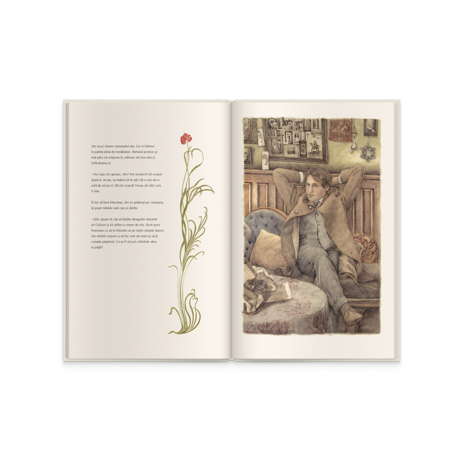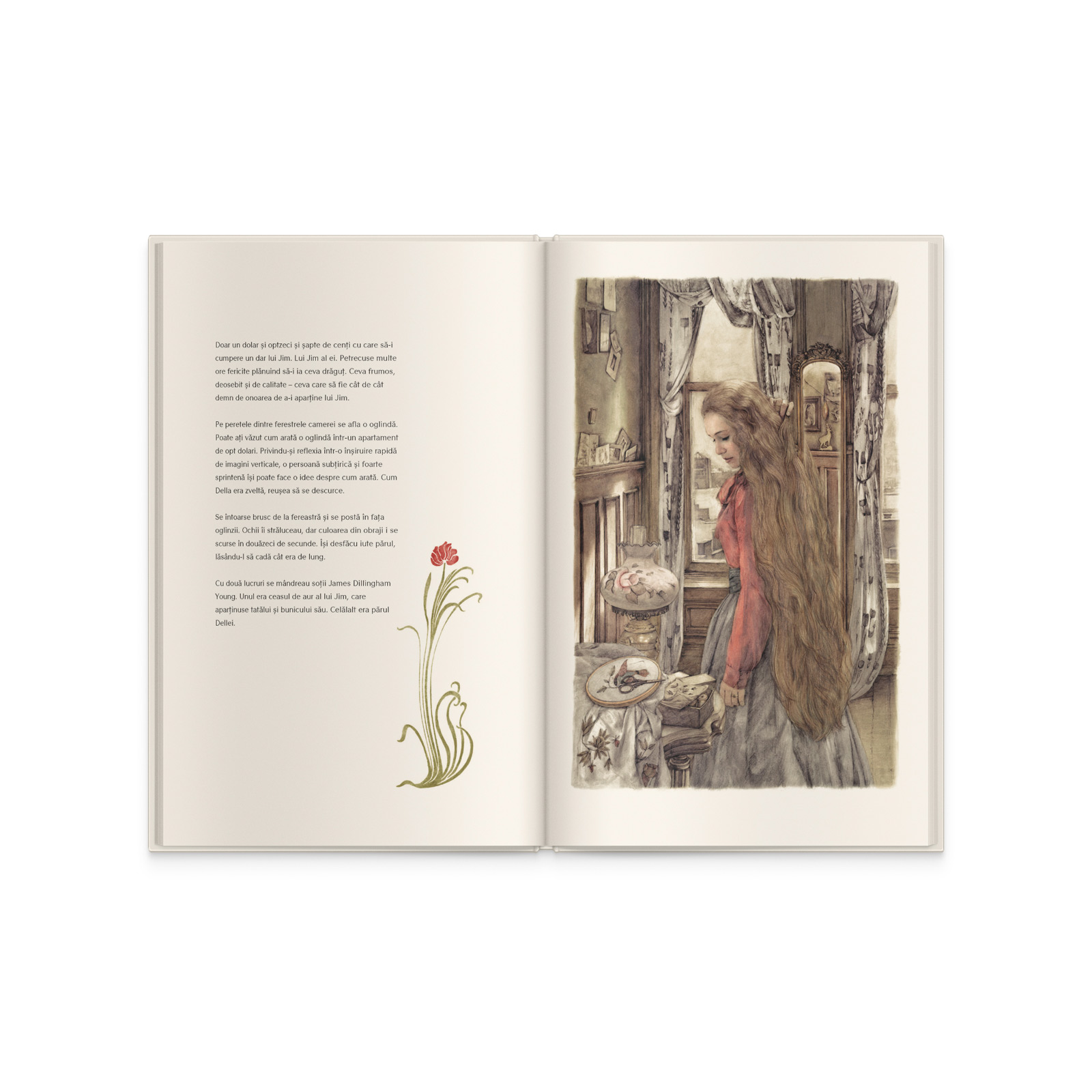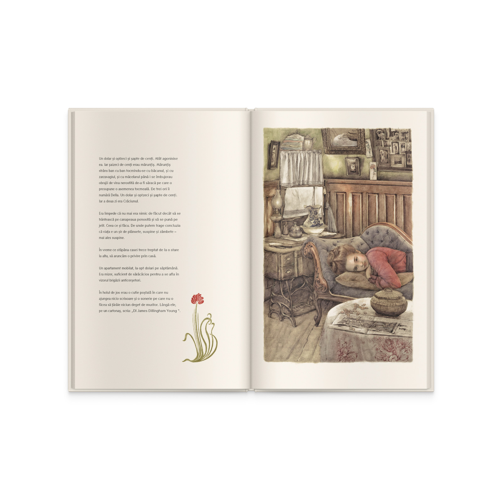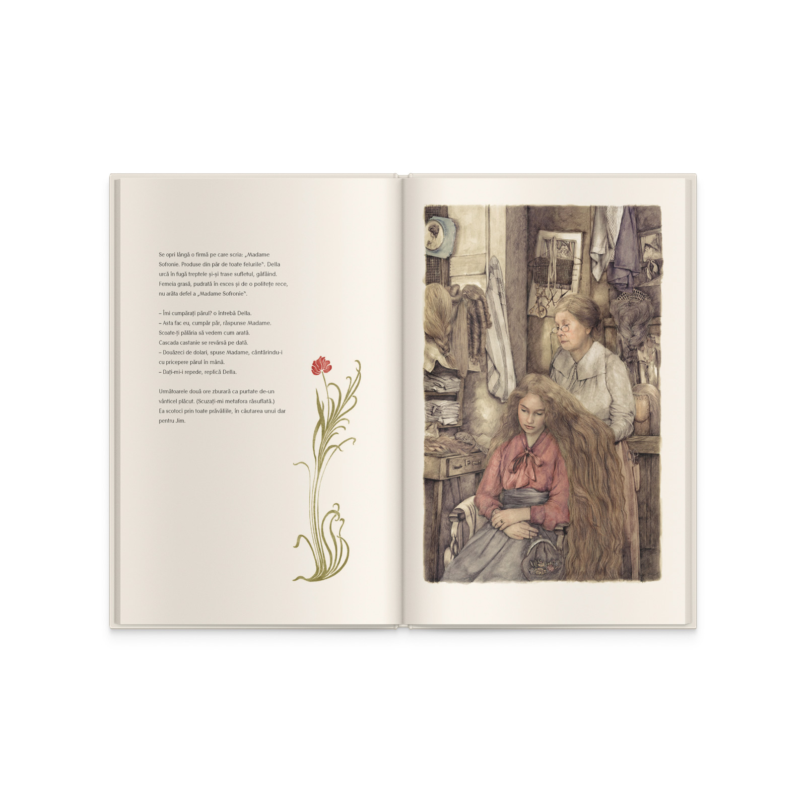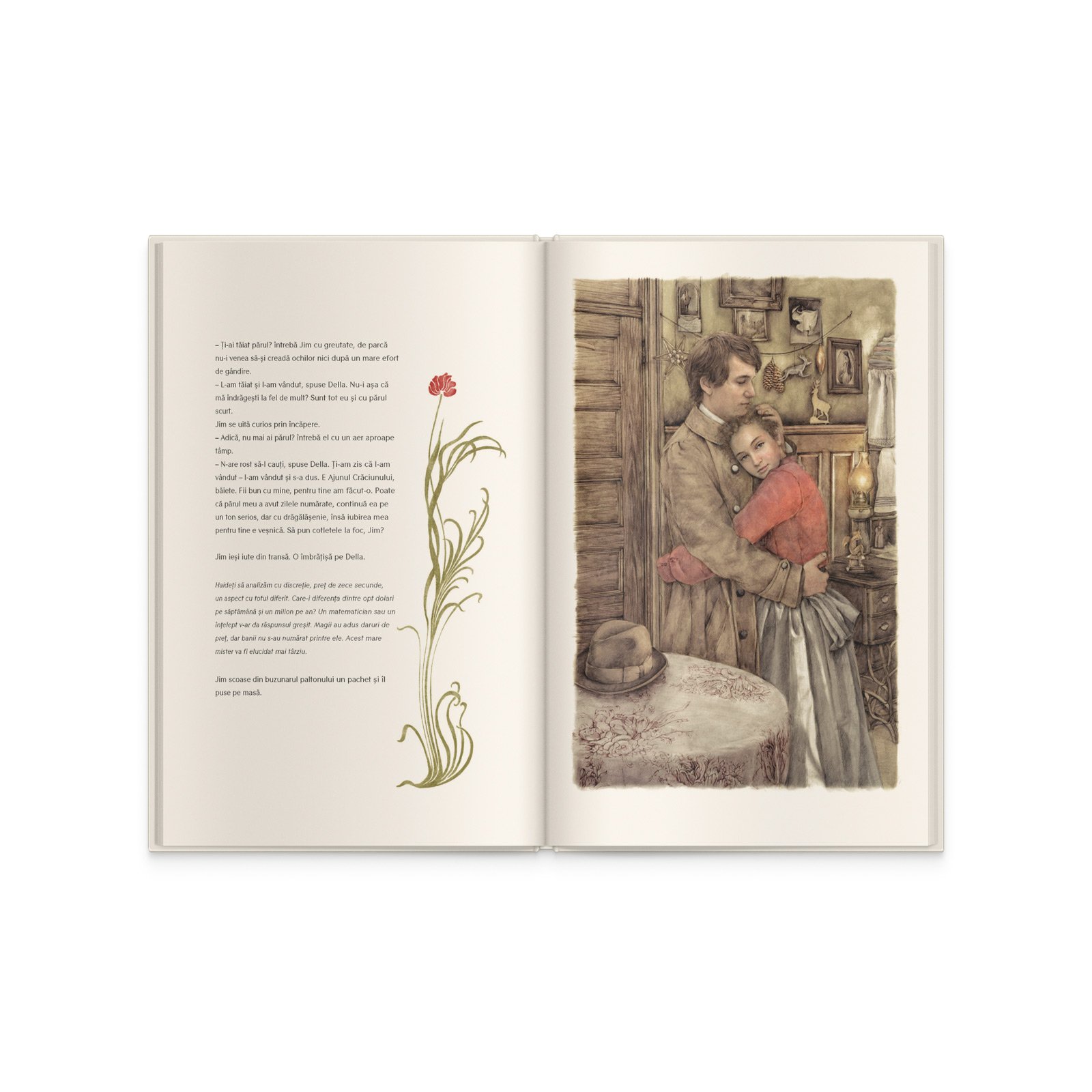 Ilustrațiile acestei povești pline de sensibilitate, zugrăvite de inconfundabila Sonja Danowski, ne poartă în lumea începutului de secol XX. Imaginile sunt detaliate și îmbogățite cu obiecte și decoruri atent studiate, în consonanță cu anii în care are loc acțiunea. Narațiunea vizuală ne introduce într-un continuum antagonic survenit din suprapunerea, în fiecare ilustrație, a două elemente de bază ale artei: forma și lumina. Forma ambientului, a contextului în care se derulează povestea în care îi regăsim pe cei doi protagoniști este simplă, modestă, pauperă. Într-o totală opoziție cu lumina caldă și plină de candoare care inspiră bunăstare. În casa Dellei și a lui Jim cele două stări sunt prezente și reale. Cei doi tineri trăiesc în sărăcie, însă se iubesc nespus.