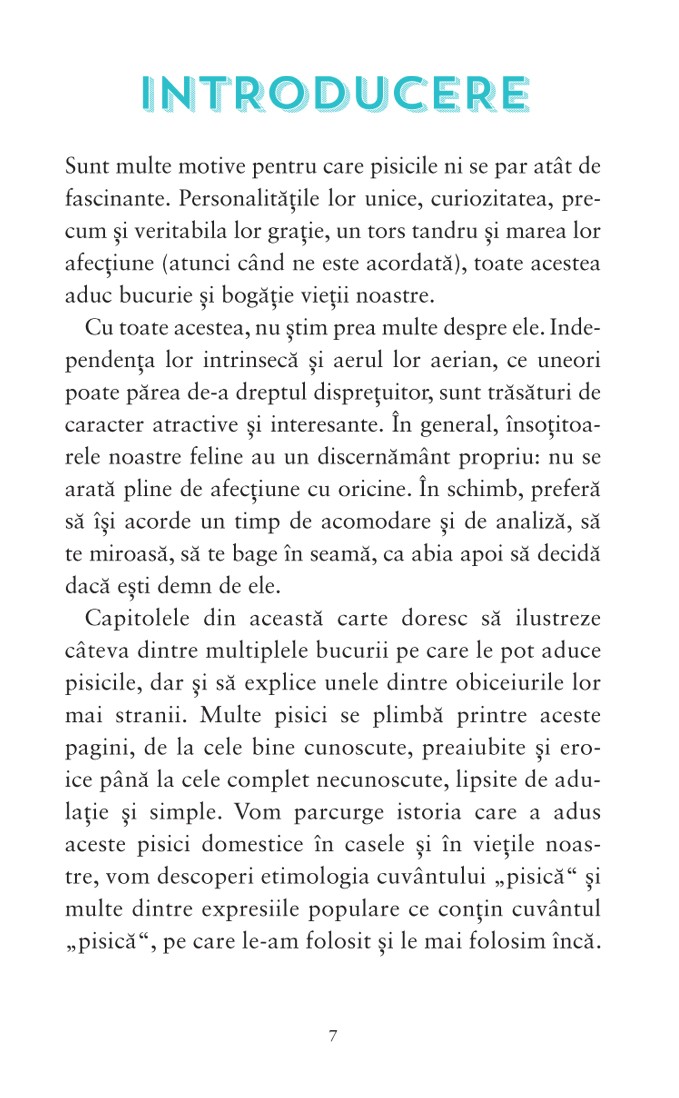 În momentele liniștite pe care le veți petrece citind această minunată carte, veți zâmbi amuzați de poveștile încântătoare despre aceste feline calde, iar citatele minunat alese vă vor confirma, dacă mai era nevoie, că momentul în care ați decis să creșteți o pisică a fost cea mai bună alegere. Atât pentru confortul ei, cât și pentru sufletul dumneavoastră.