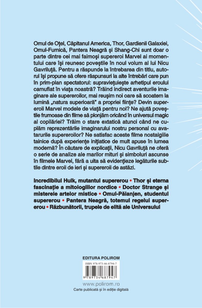 Omul de Oțel, Căpitanul America, Thor, Gardienii Galaxiei, Omul-Furnică, Pantera Neagră și Shang-Chi sunt doar o parte dintre cei mai faimoși supereroi Marvel ai momentului care își reunesc poveștile în noul volum al lui Nicu Gavriluță. Pentru a răspunde la întrebarea din titlu, autorul își propune să ofere răspunsuri la alte întrebări care pun în prim-plan spectatorul: supraviețuiește arhetipul eroului camuflat în viața noastră? Trăind indirect aventurile imaginare ale supereroilor, mai reușim noi oare să scoatem la lumină „natura superioară” a propriei ființe? Devin super-eroii Marvel modele de viață pentru noi? Ne ajută poveștile frumoase din filme să plonjăm oricând în universul magic al copilăriei? Trăim o stare extatică atunci când ne cuplăm reprezentările imaginarului nostru personal cu avatarurile supereroilor? Ne satisfac aceste filme nostalgiile tainice după experiențe inițiatice de mult apuse în lumea modernă? În căutare de explicații, Nicu Gavriluță ne oferă o serie de analize ale marilor mituri și simboluri ascunse în filmele Marvel, fără a uita să evidențieze legăturile subtile dintre eroii de ieri și supereroii de astăzi.