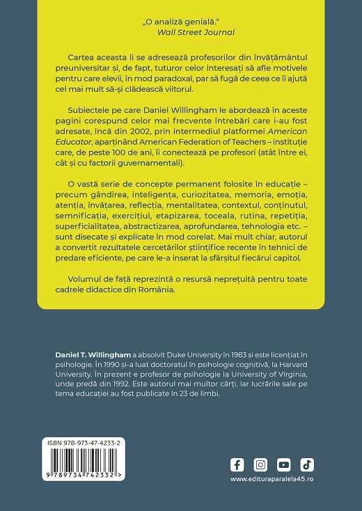 Subiectele pe care Daniel Willingham le abordează în aceste pagini corespund celor mai frecvente întrebări care i-au fost adresate, încă din 2002, prin intermediul platformei American Educator, aparținând American Federation of Teachers – instituție care, de peste 100 de ani, îi conectează pe profesori (atât între ei, cât și cu factorii guvernamentali).
