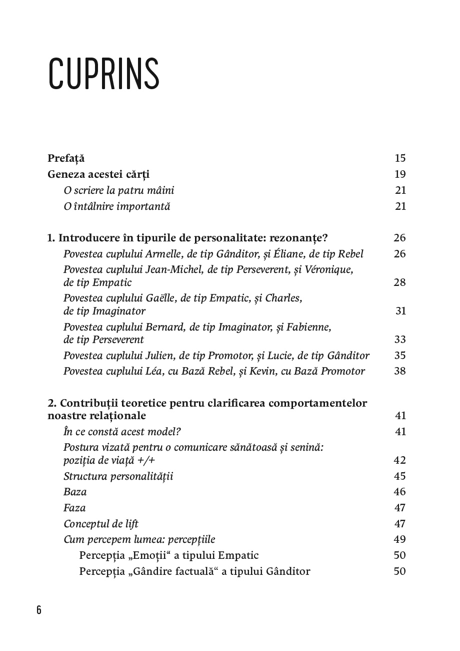 Fiecare vine în relație cu bagajul său, cu felul său de a fi, care rezonează mai mult sau mai puțin cu al celuilalt sau care se poate schimba în timp. Astfel, această carte te va ajuta să afli dacă ești Gânditor, Empatic, Perseverent, Imaginator, Rebel sau Promotor și, de asemenea, ce categorie îl definește pe partenerul tău. Apoi, printr-o serie de exemple grăitoare, vei vedea cum rezonează între ele diversele tipuri de personalitate și ce fel de probleme pot apărea în cadrul unui cuplu în funcție de acestea. Printr-o metodă clară și ușor de pus în practică, Gérard Collignon reușește să facă lumină în relațiile de cuplu tumultuoase și să găsească acel fir care să le (re)așeze pe cursul firesc al echilibrului.