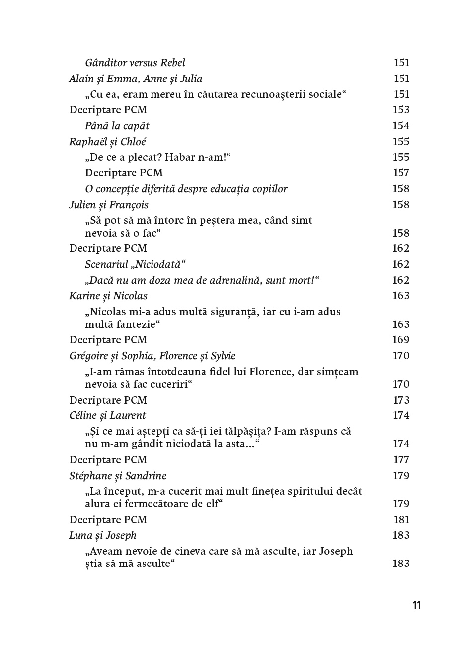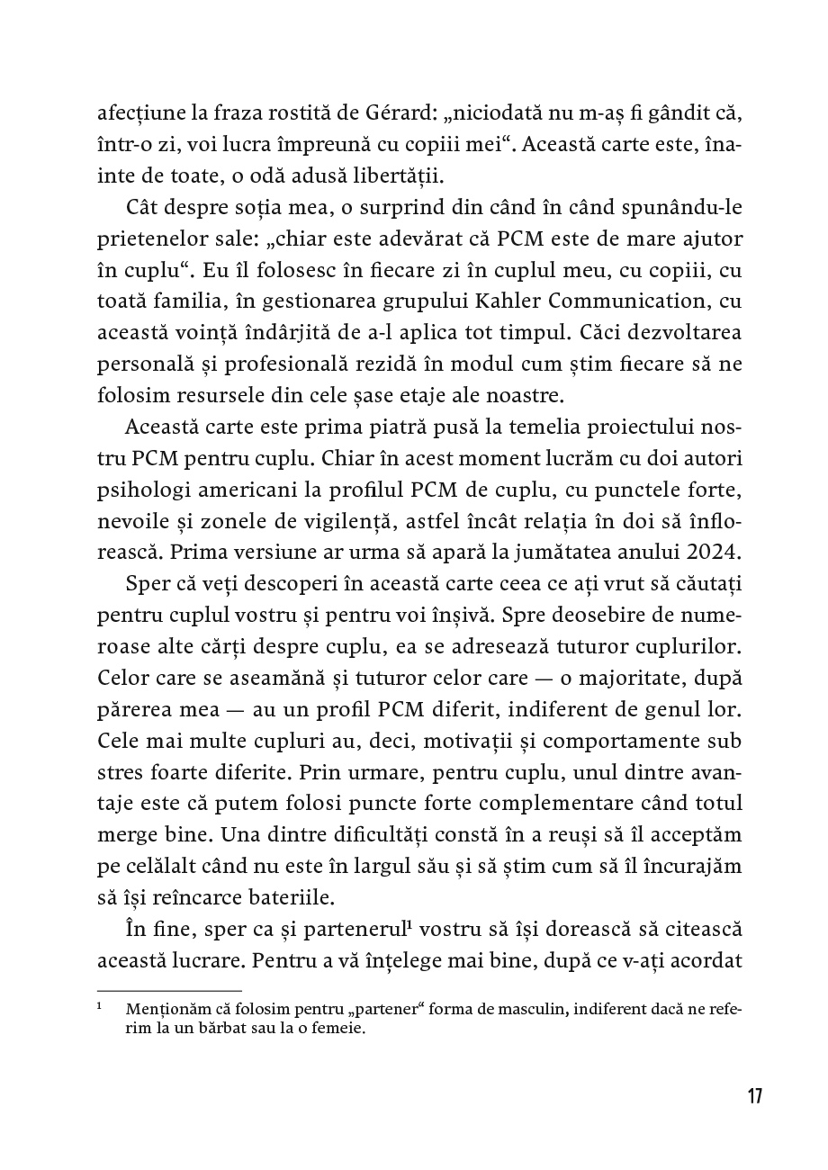 „Departe de a rezolva toate furtunile din cupluri, PCM este un instrument care poate ajuta orice cuplu în viața cotidiană. Am observat că, pentru cupluri, el începe să devină un joc de societate, care le permite o privire diferită asupra comunicării. Cuplul este un loc uimitor pentru susținere, încurajare, complicitate, care ne permite să ne bucurăm de intimitatea noastră și să descoperim intimitatea celuilalt. Depinde de noi să nu trăim această experiență de viață în mod superficial. […] Dacă nu vrem să reproducem schemele inconștiente ale părinților noștri, este bine să investim timp în noi, în cuplul și în familia noastră.” - STÉPHANE MERCIER, coach și formator PCM
