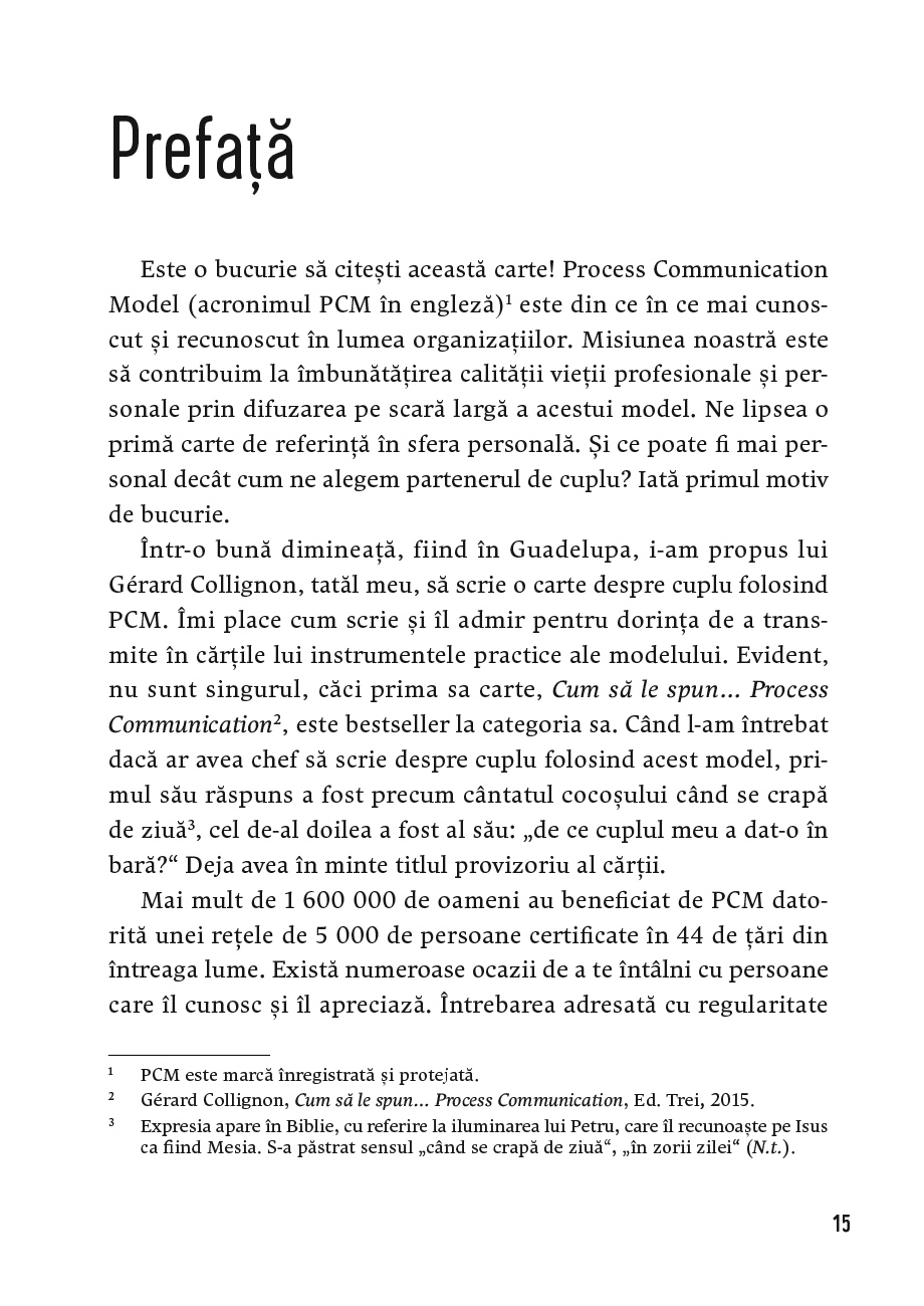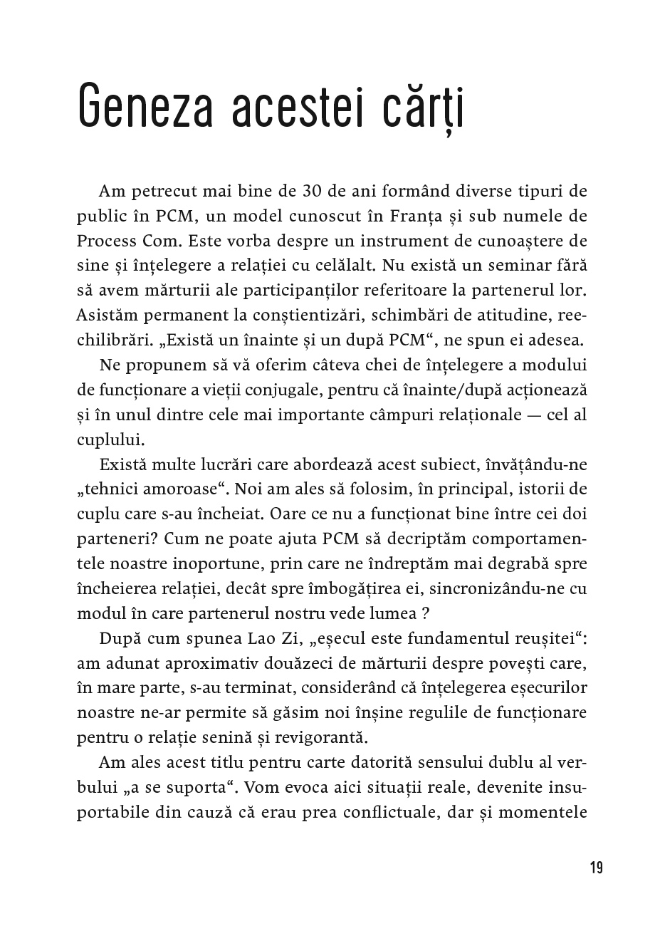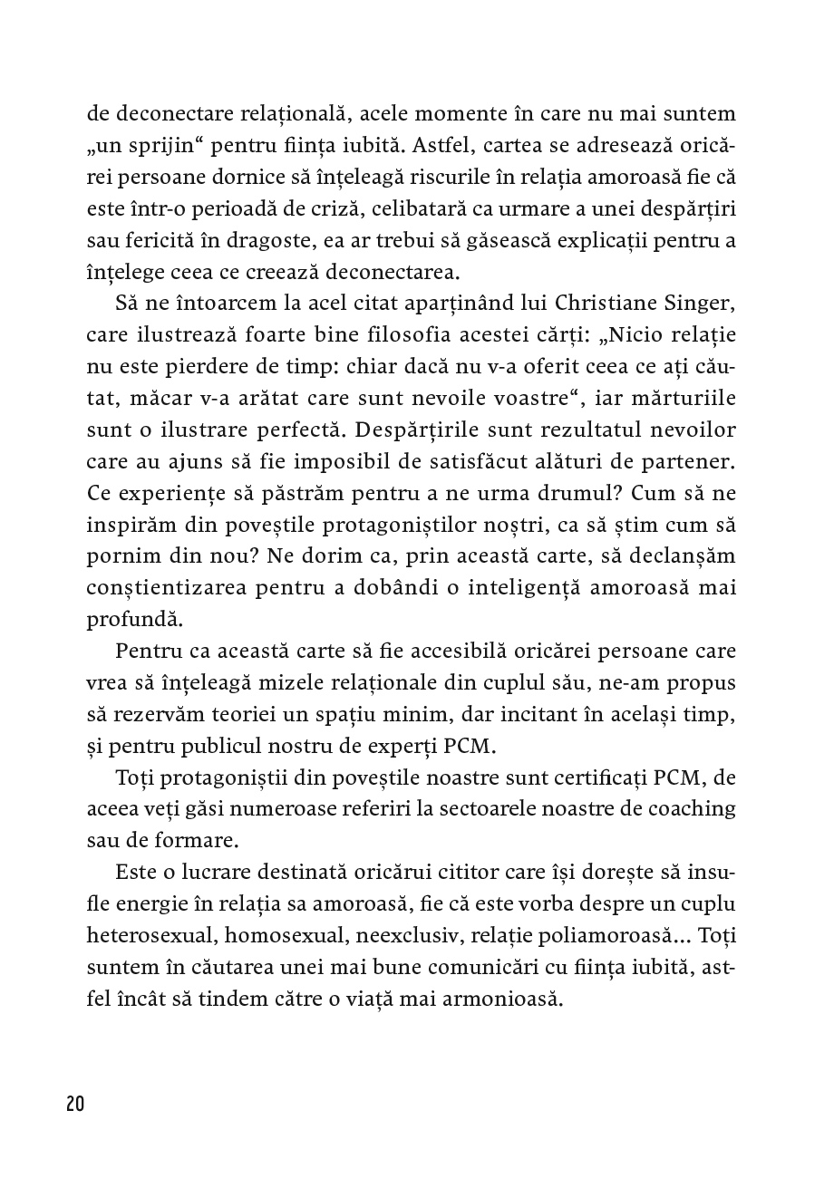 Înainte ca situația să se deterioreze iremediabil și chiar înainte de a duce relația la terapie, autorul acestei cărți vă propune să încercați metoda sa, Process Communication, care și-a dovedit utilitatea în cazul atâtor cupluri.
