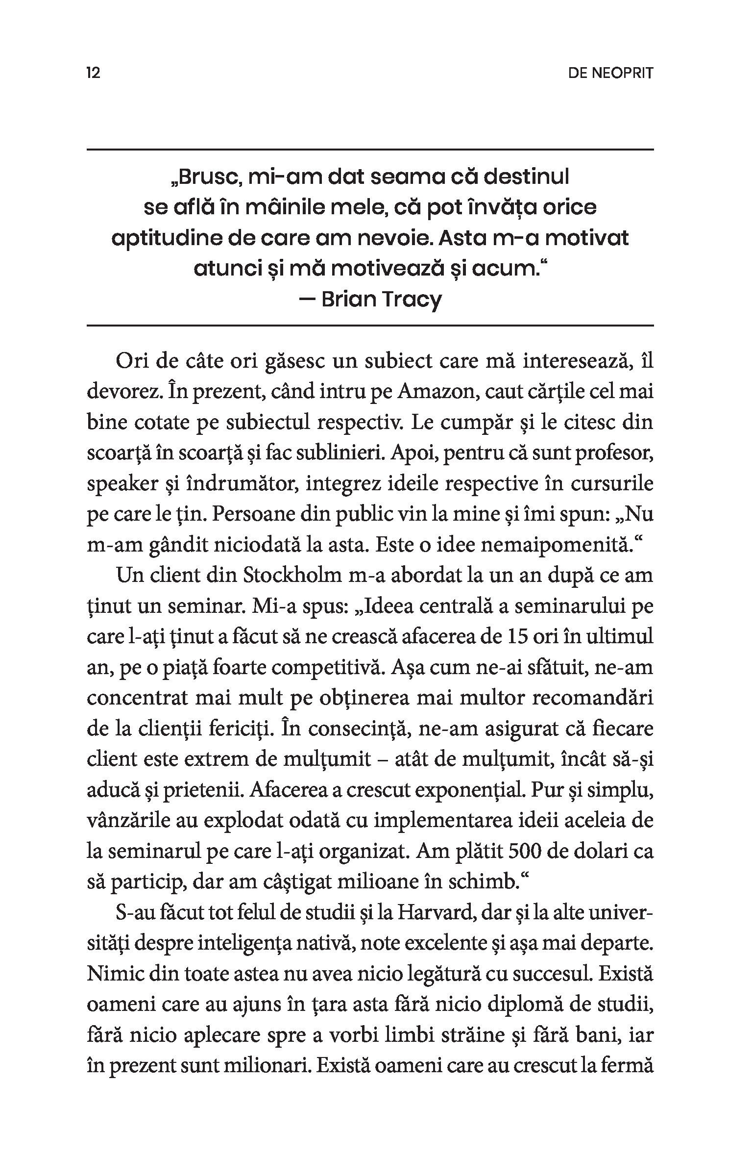 Brian Tracy este unul dintre vorbitorii și formatorii de top din întreaga lume. A ținut peste 5 000 de conferințe în mai mult de 50 de țări, pe teme precum leadershipul, strategia, vânzările, dezvoltarea personală și profesională și afacerile de succes, individualizându‑le prin amestecul unic de umor, cunoștințe, informație și inspirație.