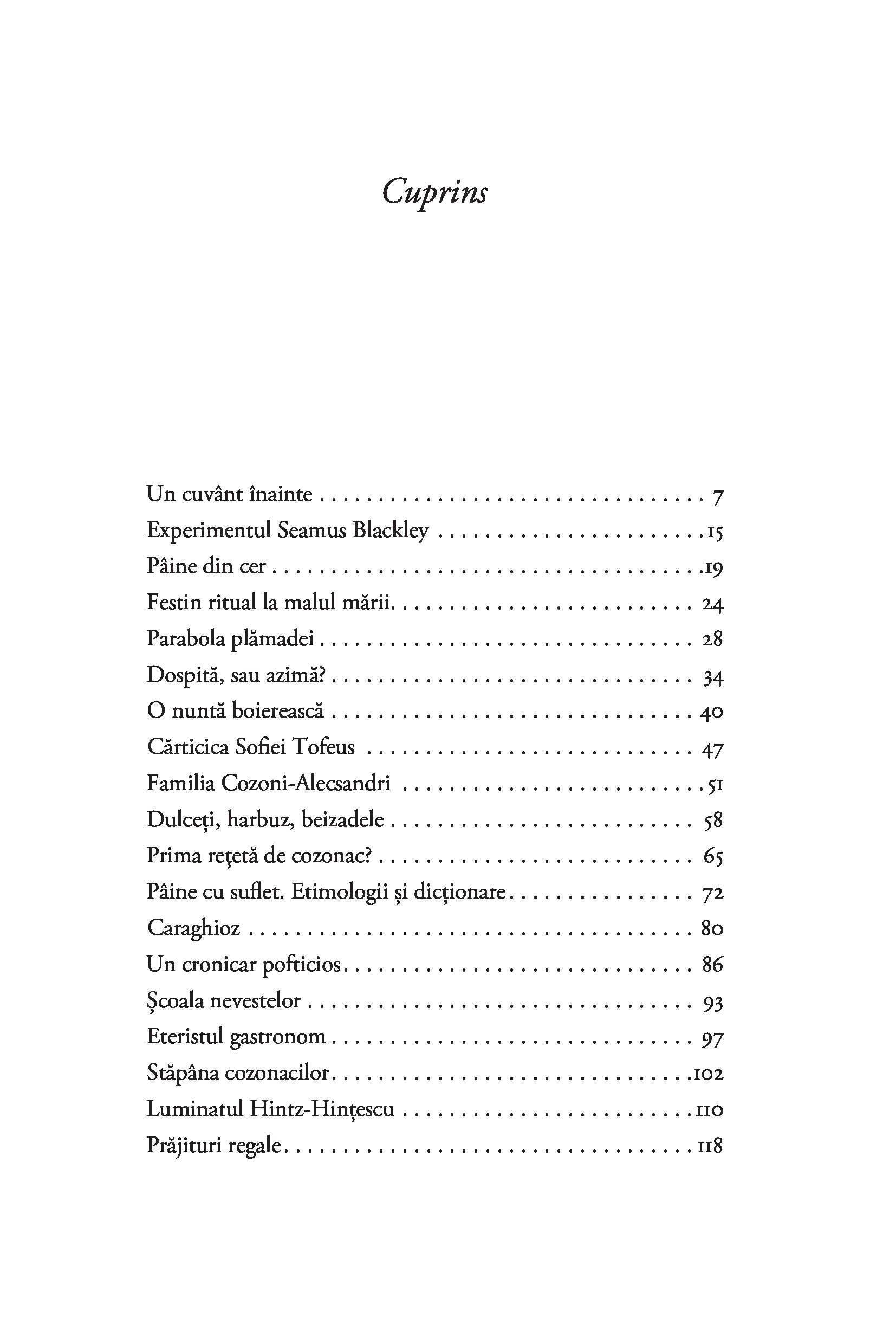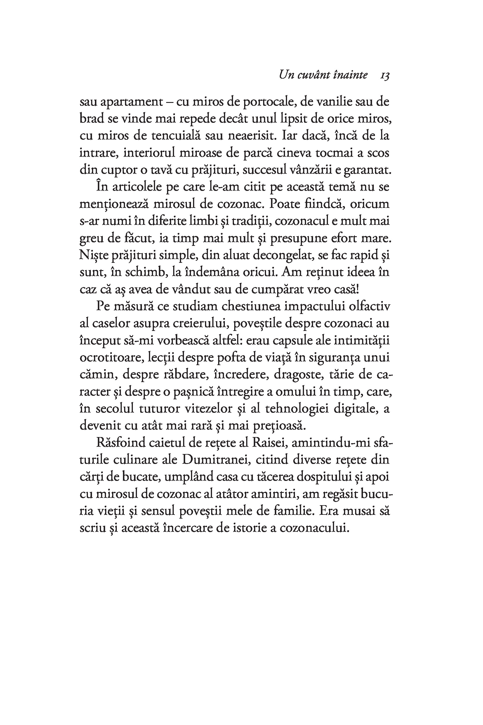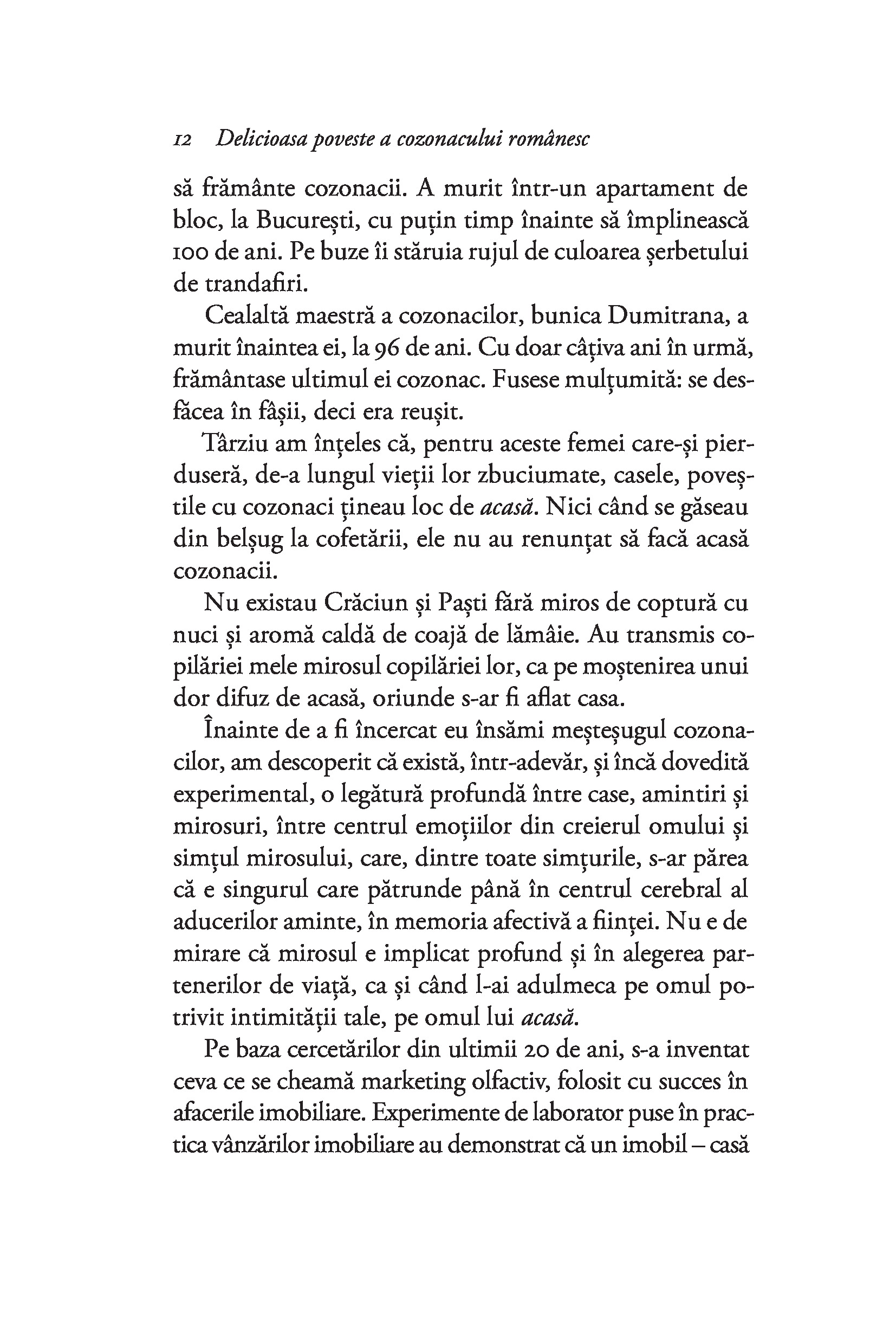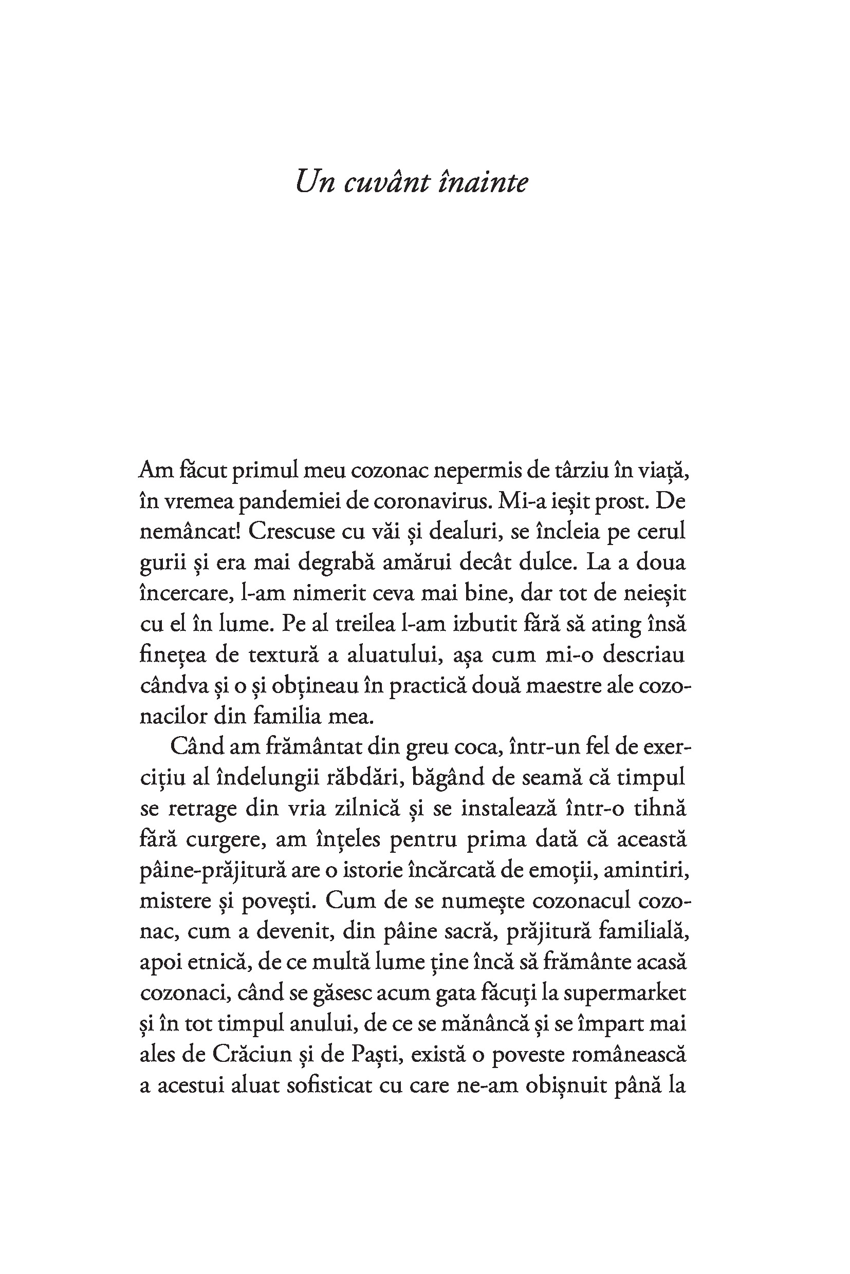 Deliciul acestei cărți e în îmbinarea dintre harul povestirii și bogăția documentării. Atras de parfumul trecutului din memorii, jurnale, opere literare, și pus pe gânduri de întrebări, ipoteze și etimologii, cititorul e purtat într-o pasionantă căutare a bucuriei de a plămădi, din chipurile cozonacului, un acasă personal sau colectiv.