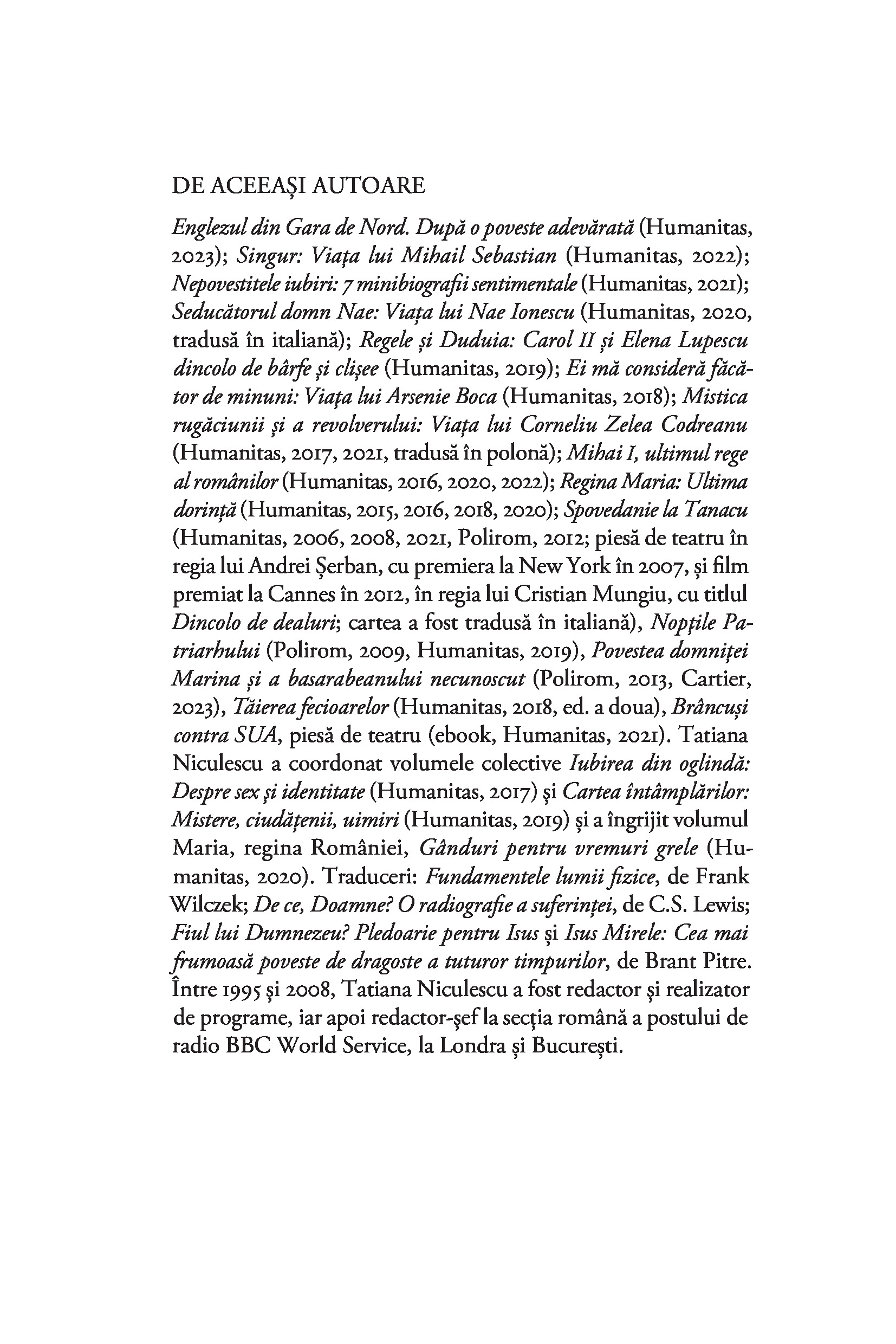 TATIANA NICULESCU este scriitoarea care a impus în literatura română contemporană genul biografiei. A publicat volumele Singur: Viața lui Mihail Sebastian (Humanitas, 2022); Nepovestitele iubiri: 7 minibiografii sentimentale (Humanitas, 2021); Seducătorul domn Nae: Viaţa lui Nae Ionescu (Humanitas, 2020, tradusă în italiană); Regele și Duduia: Carol II și Elena Lupescu dincolo de bârfe și clișee (Humanitas, 2019); Ei mă consideră făcător de minuni: Viaţa lui Arsenie Boca (Humanitas, 2018); Mistica rugăciunii și a revolverului: Viaţa lui Corneliu Zelea Codreanu (Humanitas, 2017, 2021, tradusă în poloneză); Mihai I, ultimul rege al românilor (Humanitas, 2016, 2020, 2022); Regina Maria: Ultima dorinţă (Humanitas, 2015, 2016, 2018, 2020); Spovedanie la Tanacu (Humanitas, 2006, 2008, 2021, Polirom 2012; piesă de teatru în regia lui Andrei Șerban, cu premiera la New York în 2007, și film premiat la Cannes în 2012, în regia lui Cristian Mungiu, cu titlul Dincolo de dealuri; cartea a fost tradusă în italiană), Nopţile Patriarhului (Polirom, 2009, Humanitas, 2019), Povestea domniţei Marina și a basarabeanului necunoscut (Polirom, 2013), Tăierea fecioarelor (Humanitas, 2018, ed. a doua), Brâncuși contra SUA, piesă de teatru (ebook, Humanitas, 2021). A coordonat volumele colective Iubirea din oglindă: Despre sex și identitate (Humanitas, 2017) și Cartea întâmplărilor: Mistere, ciudăţenii, uimiri (Humanitas, 2019) și a îngrijit volumul Maria, regina României, Gânduri pentru vremuri grele (Humanitas, 2020). Traduceri: Fundamentele lumii fizice de Frank Wilczek; De ce, Doamne? O radiografie a suferinței de C.S. Lewis; Fiul lui Dumnezeu? Pledoarie pentru Isus și Isus Mirele: Cea mai frumoasă poveste de dragoste a tuturor timpurilor de Brant Pitre. Între 1995 și 2008, Tatiana Niculescu a fost redactor și realizator de programe, iar apoi redactor-șef la secția română a postului de radio BBC World Service, la Londra și București.