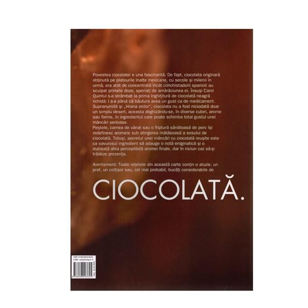 Povestea ciocolatei e una fascinanta. De fapt, ciocolata originara obtinuta pe platourile inalte mexicane, cu secole si milenii in urma, era atat de concentrata incat conchistadorii spanioli au scuipat primele doze, speriati de amaraciunea ei. Insusi Carol Quintul s-a strambat la prima inghititura de ciocolata neagra lichida: i s-a parut ca bautura avea un gust ca de medicament. Supranumita si „Hrana zeilor“, ciocolata nu a fost niciodata doar un simplu desert, aceasta deghizandu-se, in diverse culori, arome sau forme, in ingredientul care poate schimba total gustul unei mancari serioase. Pestele, carnea de vanat sau o friptura sanatoasa de porc isi redefinesc aromele sub atingerea matasoasa a sosului de ciocolata. Totusi, secretul unei mancari cu ciocolata reusite este ca savurosul ingredient sa adauge o nota enigmatica si o dulceata abia perceptibila aromei finale, dar in niciun caz sa-si tradeze prezenta. Avertisment: Toate retetele din aceasta carte contin o aluzie, un praf, un coltisor sau, cel mai probabil, bucati considerabile de ciocolata.